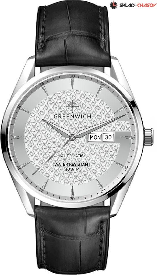 Серия Good Luck Classic входит в коллекцию автоматических часов бренда Greenwich. Классический корпус диаметром 42 мм с полированным безелем обрамляет белый циферблат часов. В центральной части циферблата — отличительная черта моделей этой серии: гильоше, объемные линии которого напоминают волны. Обратите внимание на форму пластины, где крепятся накладные риски: она сделана в форме латинской буквы G, первой буквы в названии бренда. Водостойкость равна 10 атмосфер: в этих часах можно плавать. Сквозь прозрачную заднюю крышку вы увидите детали механизма TMI с декорированным ротором: на нем выгравировано изображение символа английских моряков — парусника. Ремешок черного цвета выполнен из натуральной кожи с прошивкой в тон. Дизайн, актуальный для любого современного образа, и надежность используемых материалов делают автоматические часы Greenwich удобным и стильным аксессуаром на каждый день.