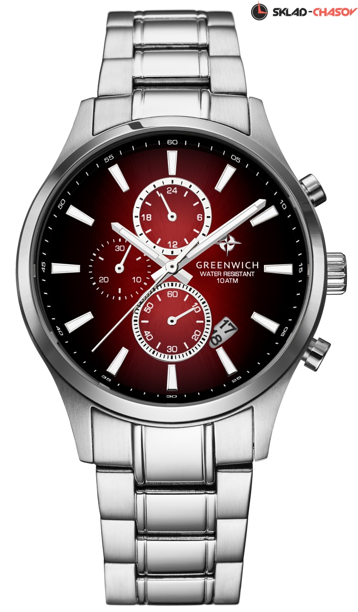 Кварцевый хронограф серии Navigator отличается вертикальной расстановкой дополнительных индикаторов на полированном циферблате с градиентом красного цвета.