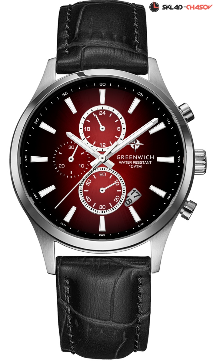 Кварцевый хронограф серии Navigator отличается вертикальной расстановкой дополнительных индикаторов на полированном циферблате с градиентом красного цвета.