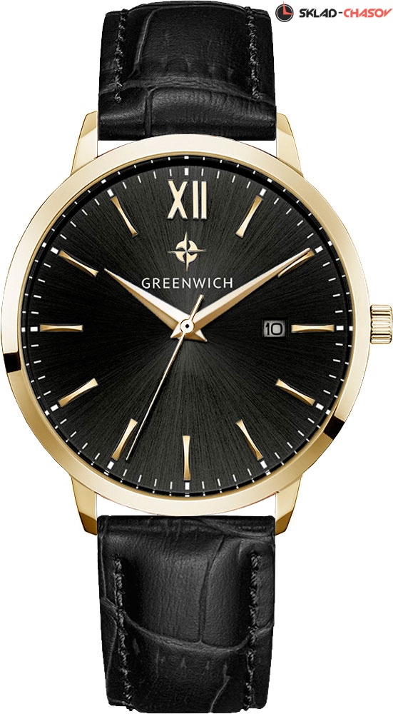 Классические мужские часы серии Brig прекрасно подойдут как под костюм, так и под одежду направления casual. В часах установлен точный японский механизм Miyota. Корпус часов изготовлен из нержавеющей гипоаллергенной стали с PVD-покрытием из желтого золота: он элегантно смотрится на руке и не создает неудобств при контакте с одеждой с длинным рукавом. Размер корпуса 41 мм. Полировка на циферблате черного цвета выполнена в виде солнечных лучей. Индексы часов изготовлены вручную и закреплены на двух штифтах. Выпуклая форма рисок создает эффект игры солнечных бликов. Объемные часовая и минутная стрелки имеют мечеобразную форму. В модели представлена дополнительная функция – дата. Ее окошко расположено на уровне трех часов. Циферблат надежно защищен минеральным стеклом. На часах установлен черный ремешок из натуральной кожи. Логотип марки – изображение «розы ветров», символа удачи и новых открытий – расположен на циферблате, заводной головке и внутренней части ремешка. Задняя крышка часов украшена изображениями логотипа и корабля, который является символом марки Greenwich.