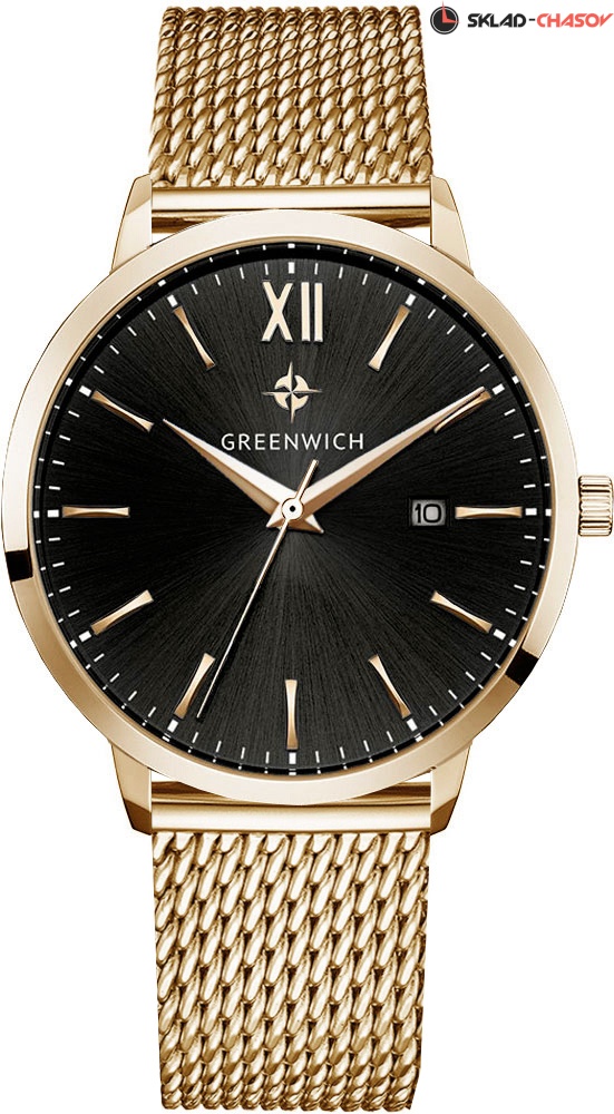 Классические мужские часы серии Brig прекрасно подойдут как под костюм, так и под одежду направления casual. В часах установлен точный японский механизм Miyota. Корпус часов изготовлен из нержавеющей гипоаллергенной стали с PVD-покрытием из розового золота: он изящно смотрится на руке и не создает неудобств при контакте с одеждой с длинным рукавом. Размер корпуса 41 мм. Полировка на циферблате черного цвета выполнена в виде солнечных лучей. Индексы часов изготовлены вручную и закреплены на двух штифтах. Выпуклая форма рисок создает эффект игры солнечных бликов. Объемные часовая и минутная стрелки имеют мечеобразную форму. В модели представлена дополнительная функция – дата. Ее окошко расположено на уровне трех часов. Циферблат надежно защищен минеральным стеклом. На часах установлен стальной браслет миланского плетения. Логотип марки – изображение «розы ветров», символа удачи и новых открытий – расположен на циферблате, заводной головке и внутренней части ремешка. Задняя крышка часов украшена изображениями логотипа и корабля, который является символом марки Greenwich.