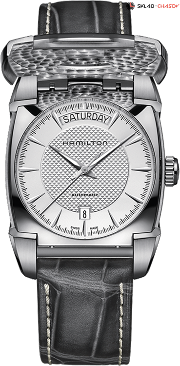 Крышка с рельефным логотипом и двумя окошками, показывающими день и дату, украшена узором «парижские гвозди». Лимитированная серия 999 экземпляров