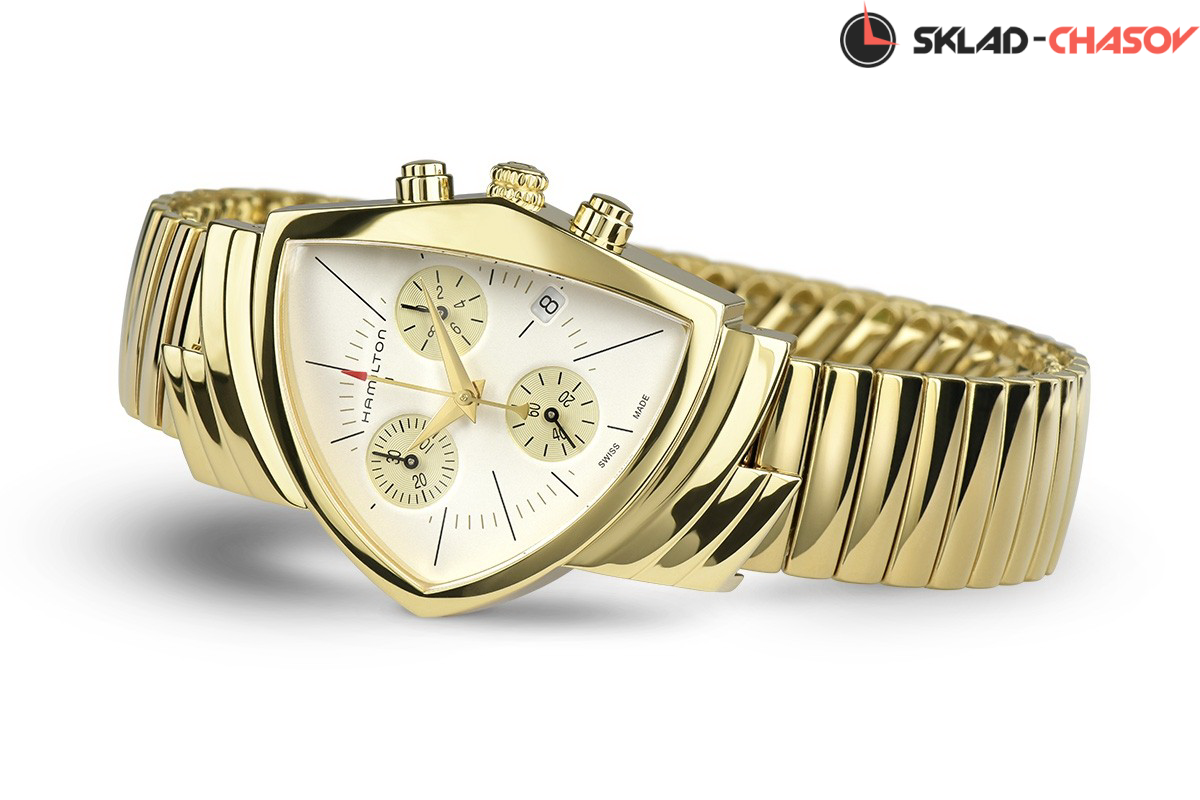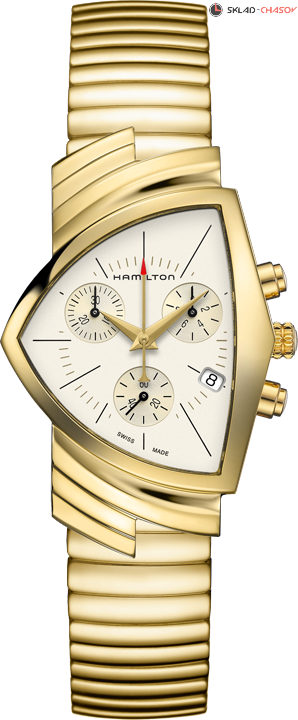Последнее воплощение Ventura - модель со спортивным хронографом. Окошко даты в положении 4 часа. Браслет сделан эластичным, что делает эти часы удобным и комфортным аксессуаром.