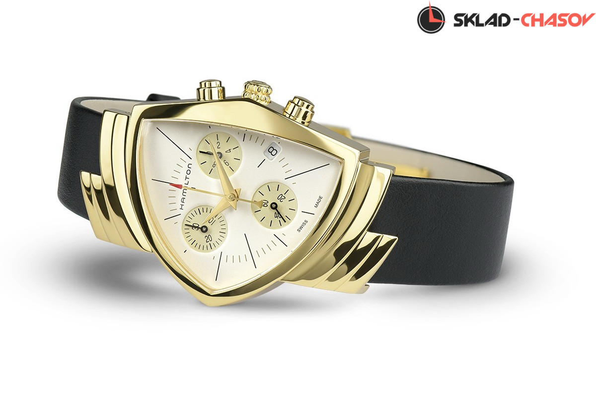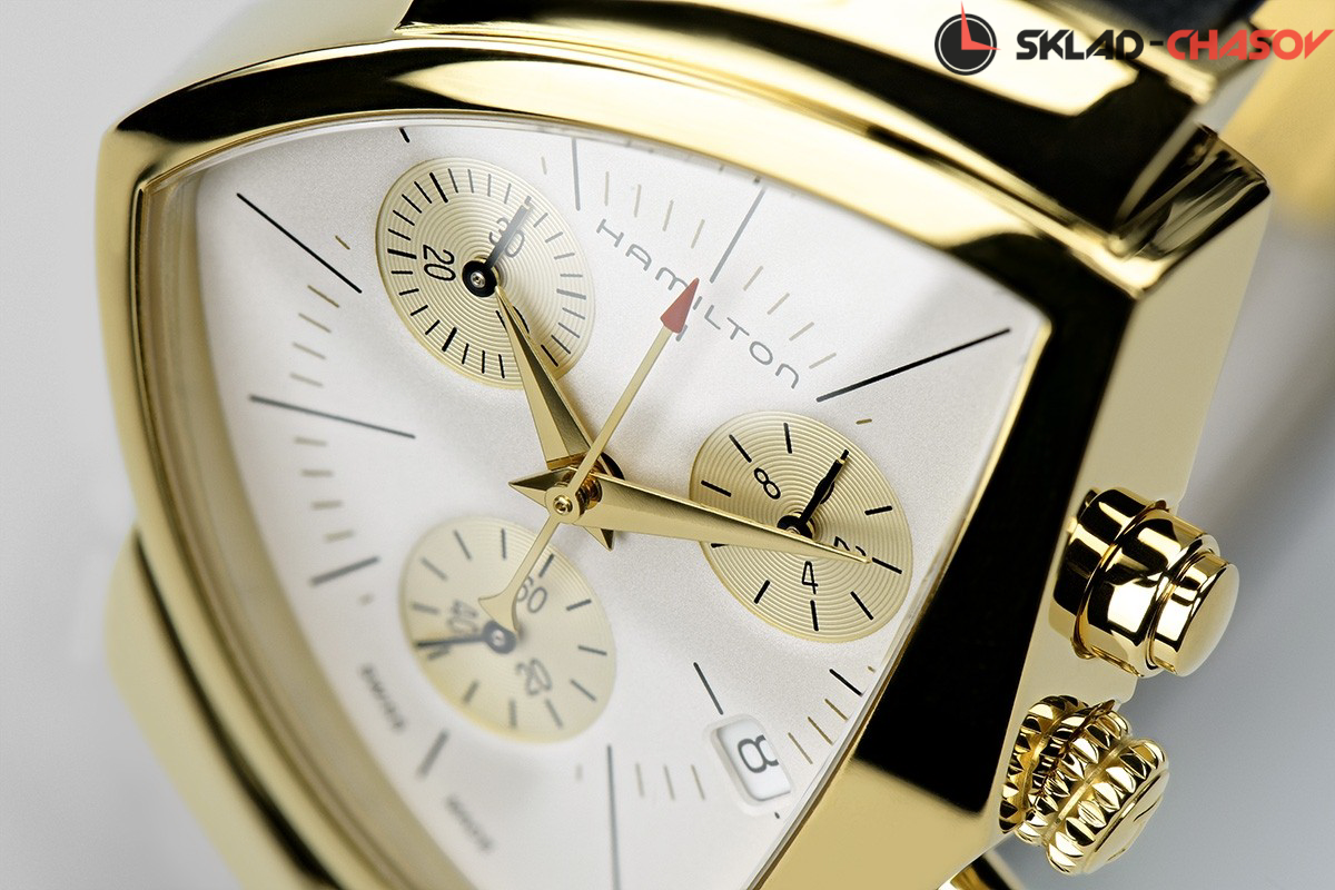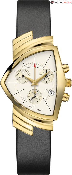 Последнее воплощение Ventura - модель со спортивным хронографом. Окошко даты в положении 4 часа. Браслет сделан эластичным, что делает эти часы удобным и комфортным аксессуаром.