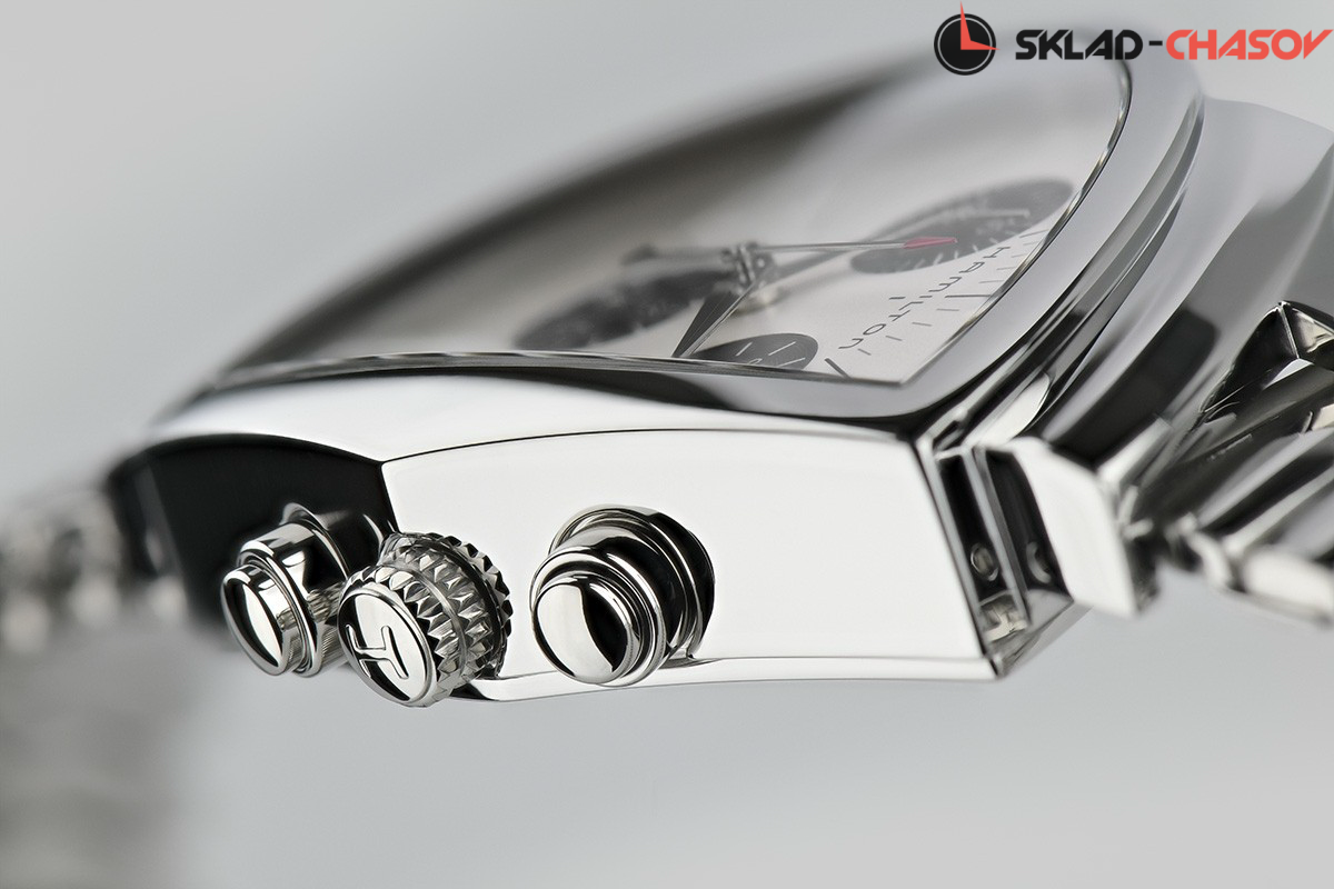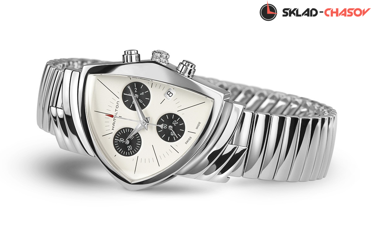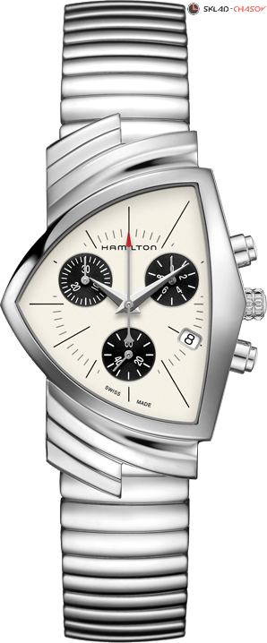 Последнее воплощение Ventura - модель со спортивным хронографом. Окошко даты в положении 4 часа. Браслет сделан эластичным, что делает эти часы удобным и комфортным аксессуаром.