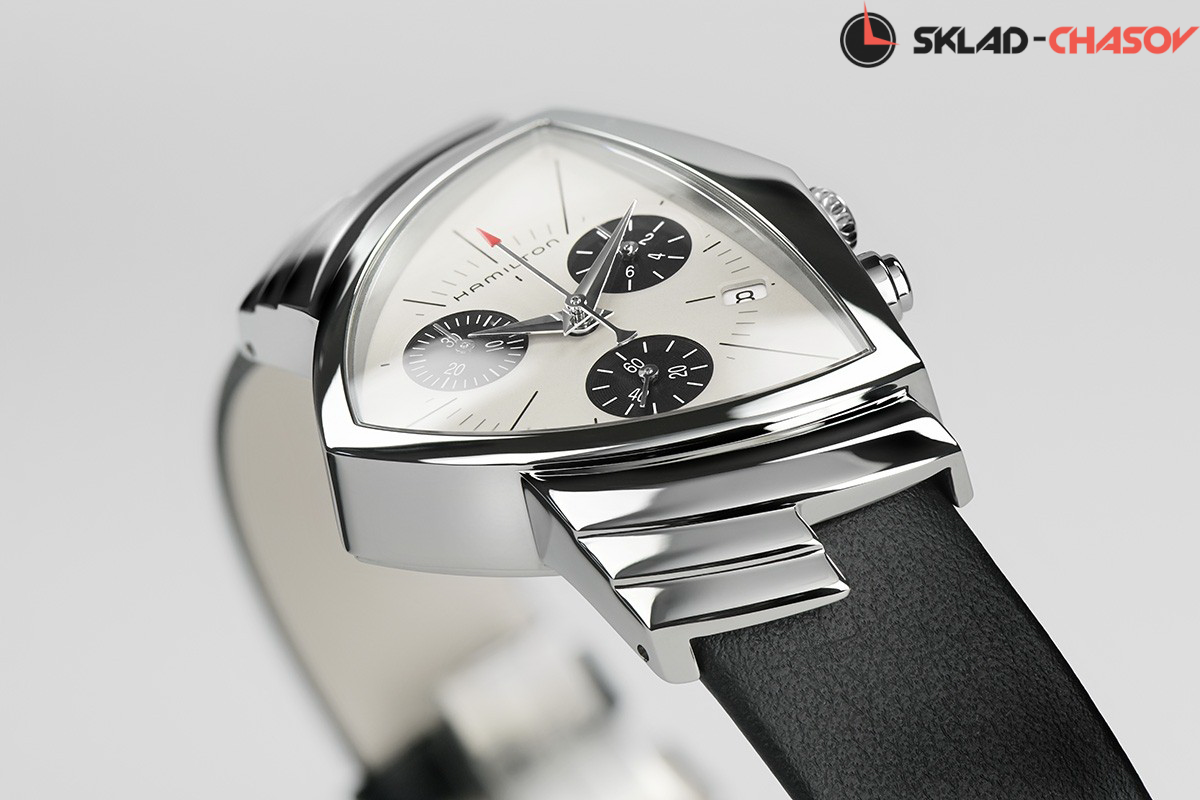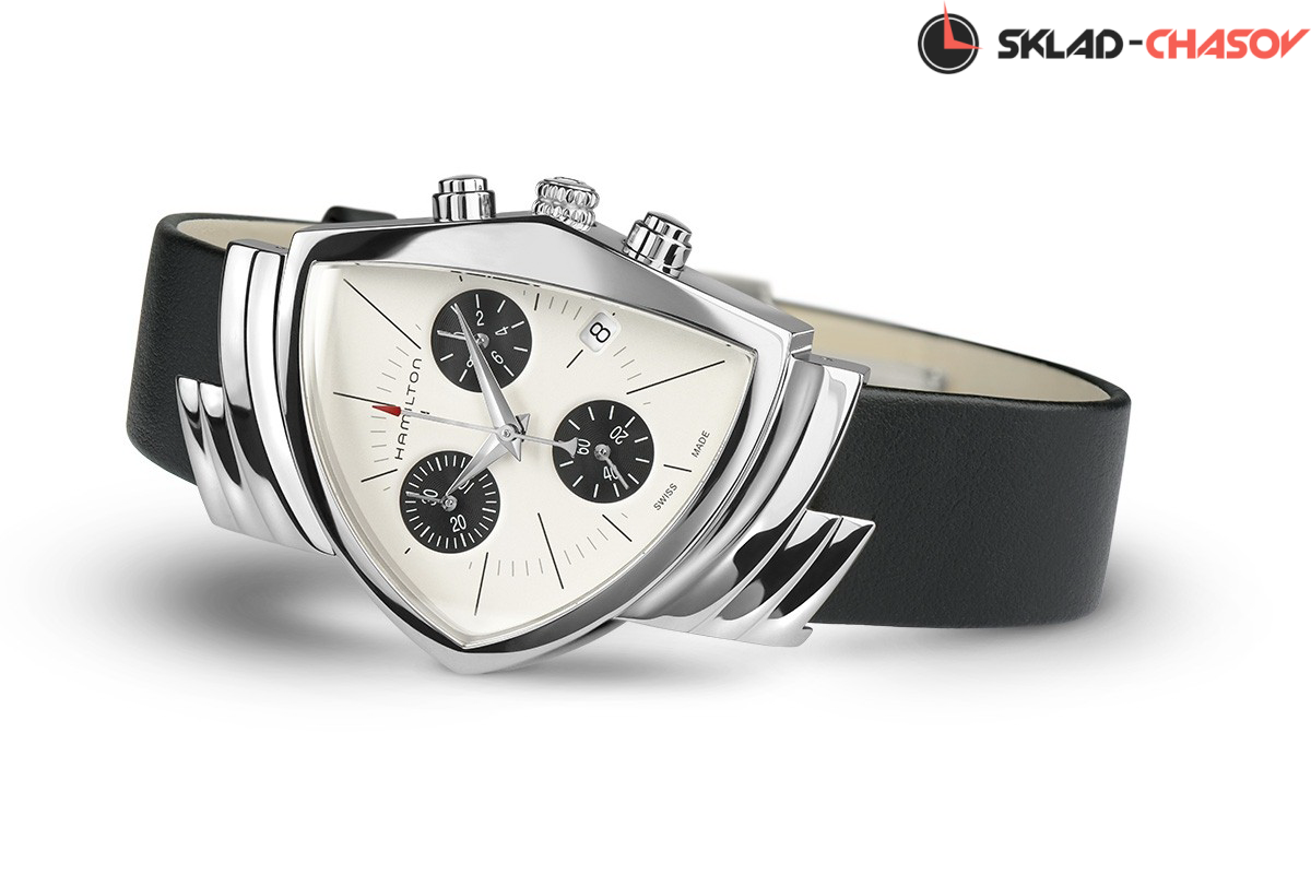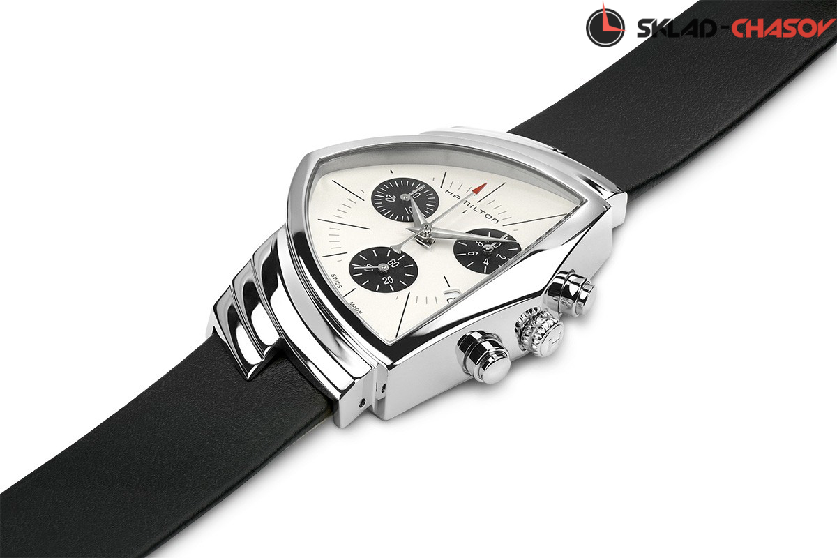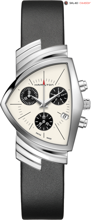 Последнее воплощение Ventura - модель со спортивным хронографом. Окошко даты в положении 4 часа. Браслет сделан эластичным, что делает эти часы удобным и комфортным аксессуаром.