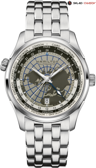 Мужская модель с индикацией времени второго часового пояса, в виде узора карты и 24-часовой разметки на циферблате, регулируется с помощью коронки на 8 часов. Апертура даты в положении 6 часов. Люминесцентное покрытие на стрелках.