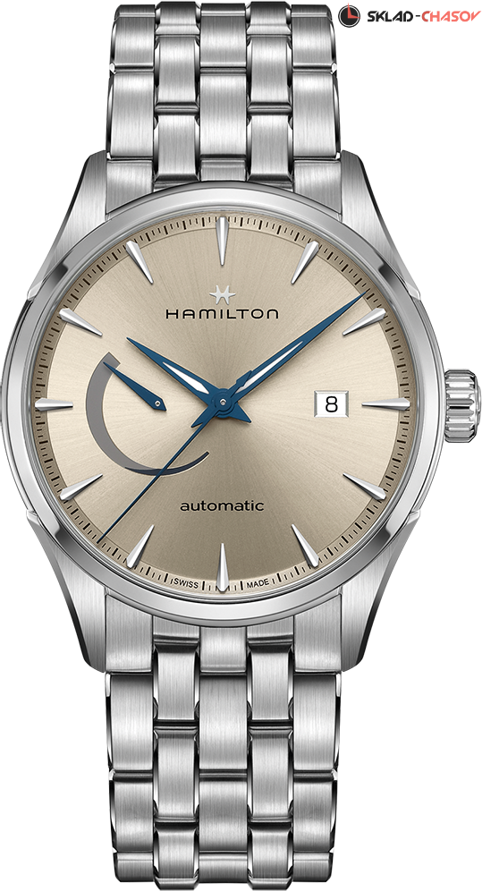 Мужская модель с индикацией запаса хода в положении между 6 и 10-ю часами, окошко даты в положении 3 часа.