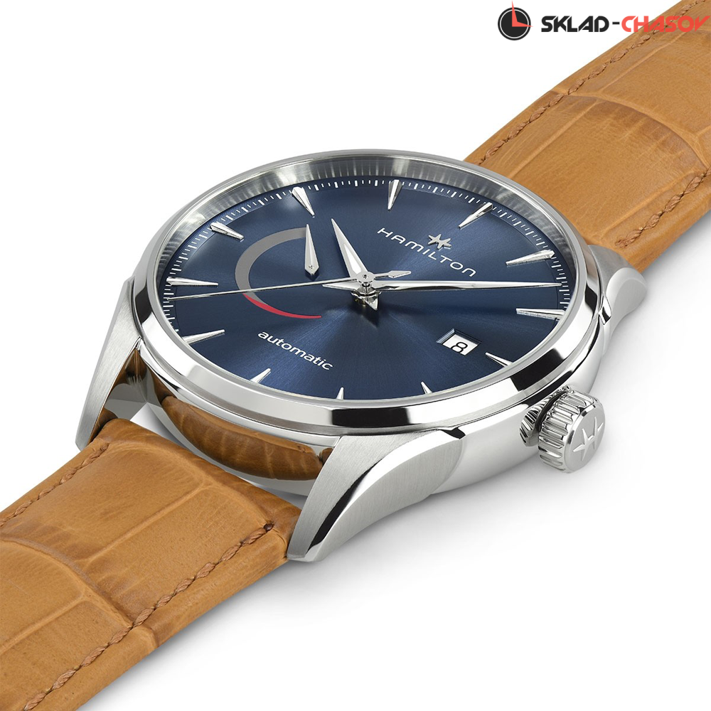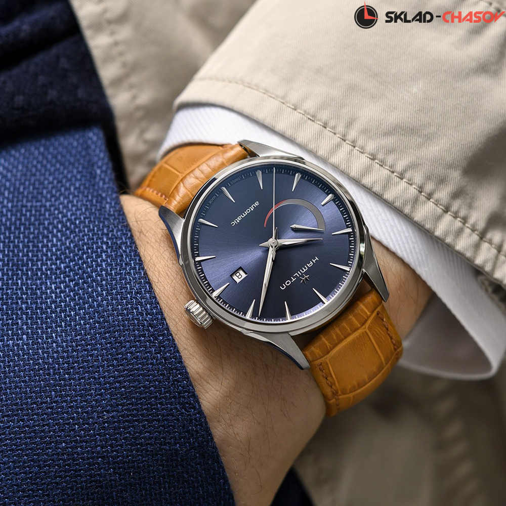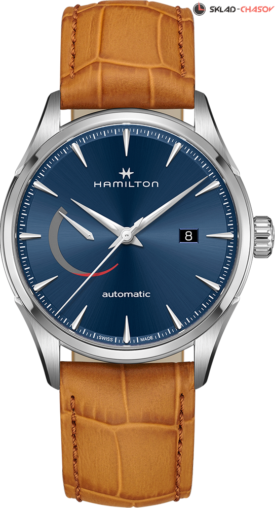 Мужская модель с индикацией запаса хода в положении между 6 и 10-ю часами, окошко даты в положении 3 часа.