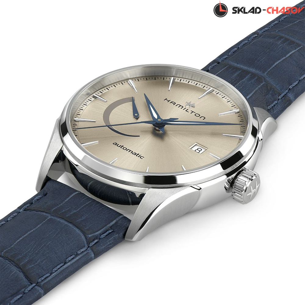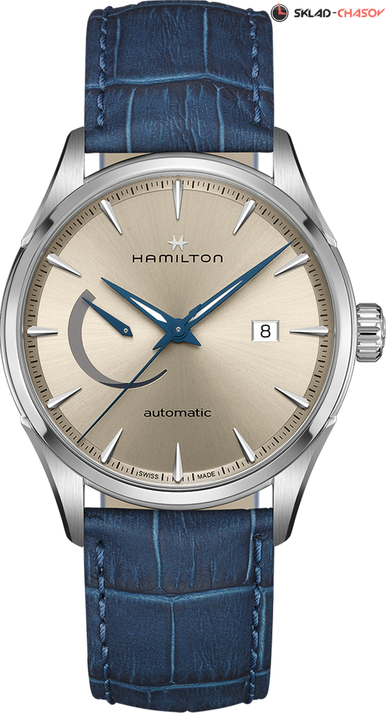 Мужская модель с индикацией запаса хода в положении между 6 и 10-ю часами, окошко даты в положении 3 часа.