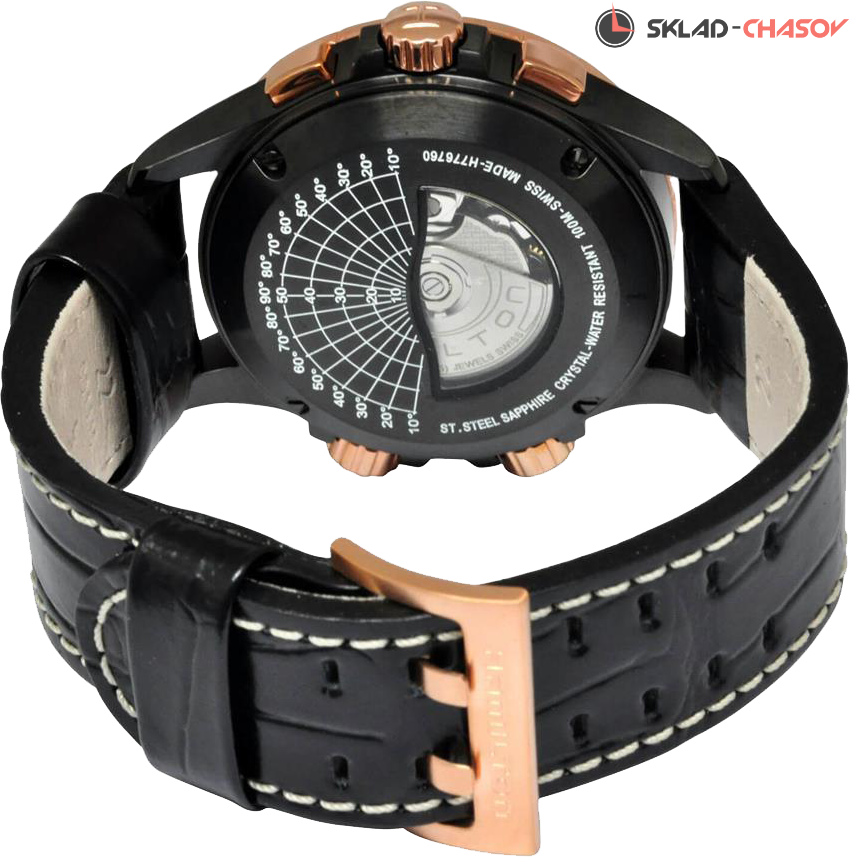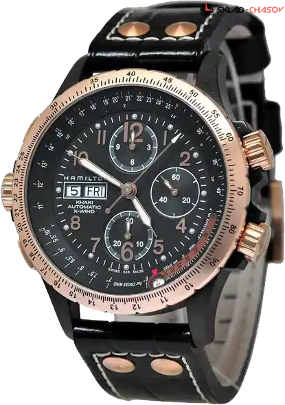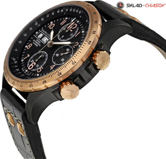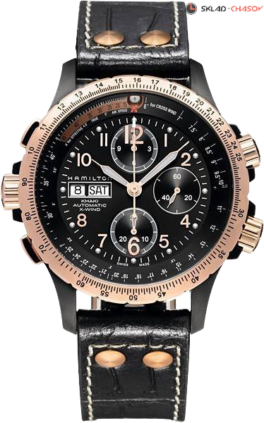 Сложная модель с авиационными функциями расчета. Хронограф, логарифмическая линейка, вращающаяся шкала. Индикация даты и дня недели в положении 9 часов.