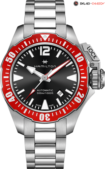 Дайверские часы. Однонаправленно вращающийся безель. Люминесцентное покрытие. Окошко даты между 4 и 5 часами.