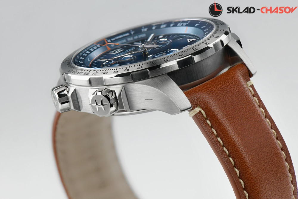 Кварцевый хронограф. Индикация второго часового пояса GMT с помощью счетчика в положении 10 часов. Покрытые составом Superluminova® крупные цифры и стрелки в спортивном стиле гарантируют оптимальную считываемость показаний при самом мимолетном взгляде на циферблат. Окошко индикатора даты в положении 3 часов.