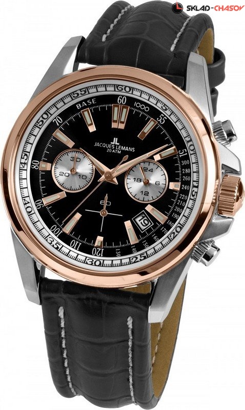 Легендарный хронограф Jacques Lemans с кварцевым механизмом выпускается уже более 20 лет и неизменно пользуется любовью покупателей. Круглый корпус диаметром 44 мм сделан из нержавеющей стали: прочного материала с гипоаллергенными свойствами. Безель украшен PVD-покрытием из золота розового оттенка. На объемном черном циферблате все идеально продумано и сбалансировано: каждая стрелка, каждая цифра или риска хорошо читаются. Здесь расположили 24-часовой индикатор, минутный и секундный накопители, окошко даты, тахиметрическую шкалу и дополнительную шкалу индикации секунд. Центральные часовая и минутная стрелки и риски покрыты люминесцентным составом, благодаря которому время легко определяется даже в темноте. Минеральное стекло Crystex отличается повышенной ударопрочностью. Заводная головка и задняя крышка модели завинчиваются, обеспечивая водостойкость в 20 атмосфер (в часах можно плавать и заниматься снорклингом). Плотный ремешок черного цвета сделан из натуральной кожи с прошивкой. Стильный и надежный хронограф Jacques Lemans будет выигрышно смотреться на вашем запястье в любой ситуации: и на деловой встрече, и во время занятий спортом.
