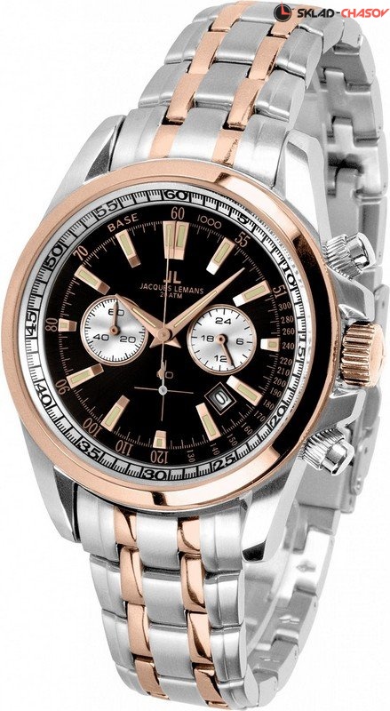 Легендарный хронограф Jacques Lemans с кварцевым механизмом выпускается уже более 20 лет и неизменно пользуется любовью покупателей. Круглый корпус диаметром 44 мм сделан из нержавеющей стали: прочного материала с гипоаллергенными свойствами. Безель украшен PVD-покрытием из золота розового оттенка. На полированном черном циферблате все идеально продумано и сбалансировано: каждая стрелка, каждая цифра или риска хорошо читаются. Здесь расположили 24-часовой индикатор, минутный и секундный накопители, окошко даты, тахиметрическую шкалу и дополнительную шкалу индикации секунд. Центральные часовая и минутная стрелки и риски покрыты люминесцентным составом, благодаря которому время легко определяется даже в темноте. Минеральное стекло Crystex отличается повышенной ударопрочностью. Заводная головка и задняя крышка модели завинчиваются, обеспечивая водостойкость в 20 атмосфер (в часах можно плавать и заниматься снорклингом). На браслет из литых стальных звеньев установлена удобная застежка-клипса. Стильный и надежный хронограф Jacques Lemans будет выигрышно смотреться на вашем запястье в любой ситуации: и на деловой встрече, и во время занятий спортом.