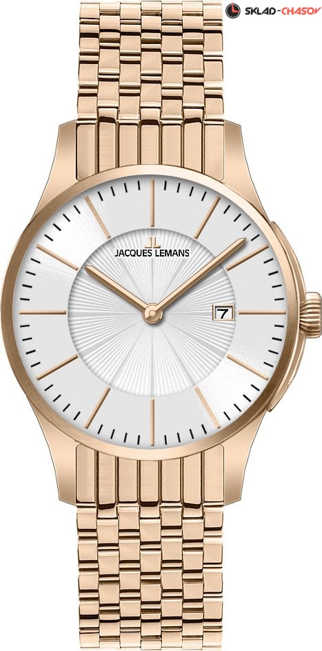 Кварцевые часы установлены в корпус универсального диаметра 38 мм из гипоаллергенной нержавеющей стали c PVD-покрытием из золота розового оттенка. Узор гильоше в центральной зоне служит фоном хорошо читаемым стрелками часов и минут. В позиции «3 часа» - окошко даты.