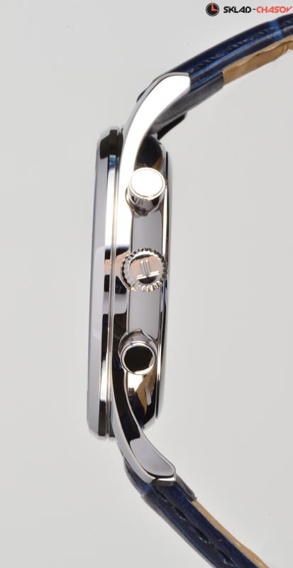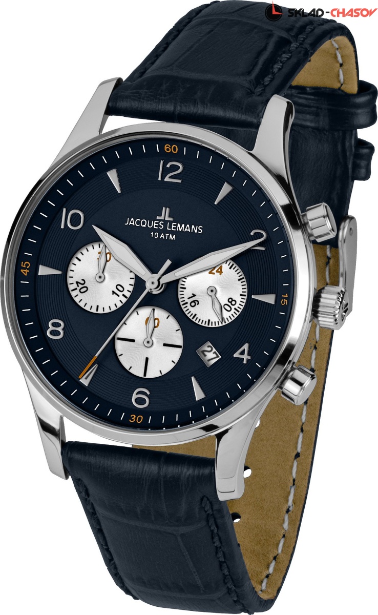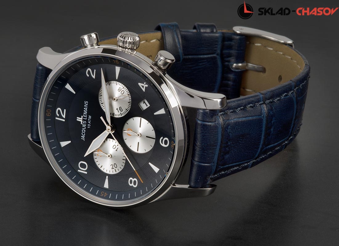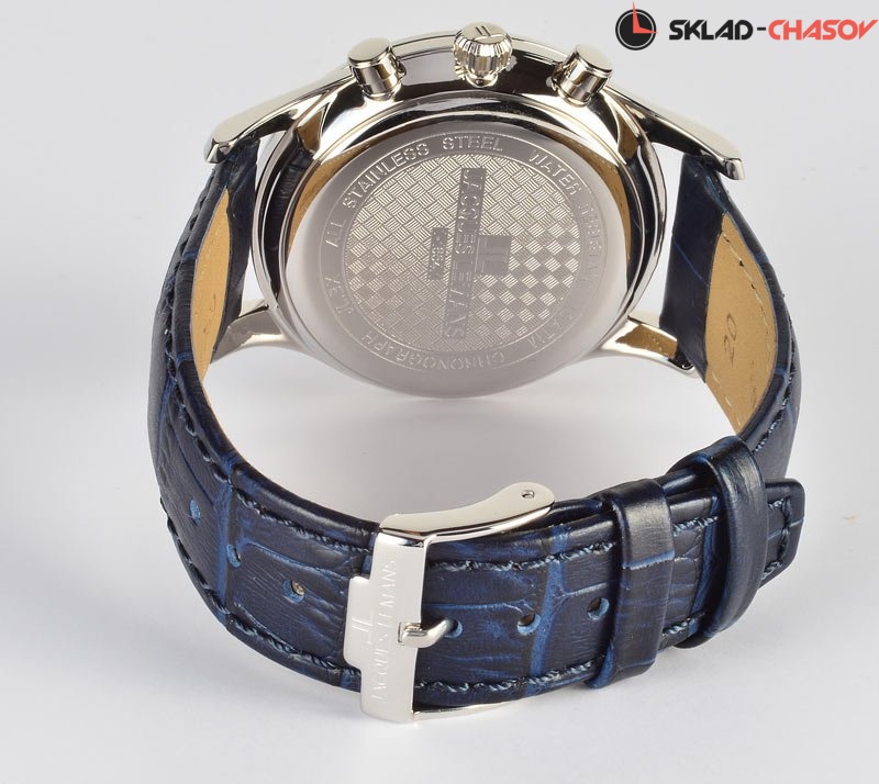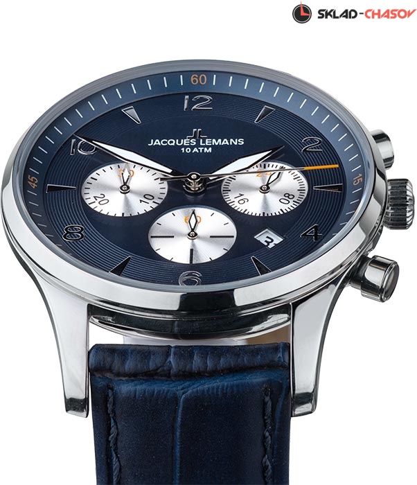 В хронографе Jacques Lemans установлен японский кварцевый механизм Miyota. Его надежно защищает прочный корпус диаметром 40 мм из нержавеющей стали. Объемным темно-синим циферблатом удобно пользоваться: дополнительные индикаторы (24-х часов, минутный и секундный накопители) выделены полировкой в виде солнечных лучей. Хорошо читаются центральные стрелки часов, минут и секунд. В модели предусмотрена функция даты: окошко расположено между 4 и 5 часами. К плюсам часов относится ударопрочное минеральное стекло Crystex. Повышенная водостойкость равна 10 атмосфер. Ремешок сделан из натуральной кожи темно-синего цвета с прошивкой. Этот аксессуар – яркий пример универсального и стильного хронографа - необходимая деталь любого мужского гардероба.