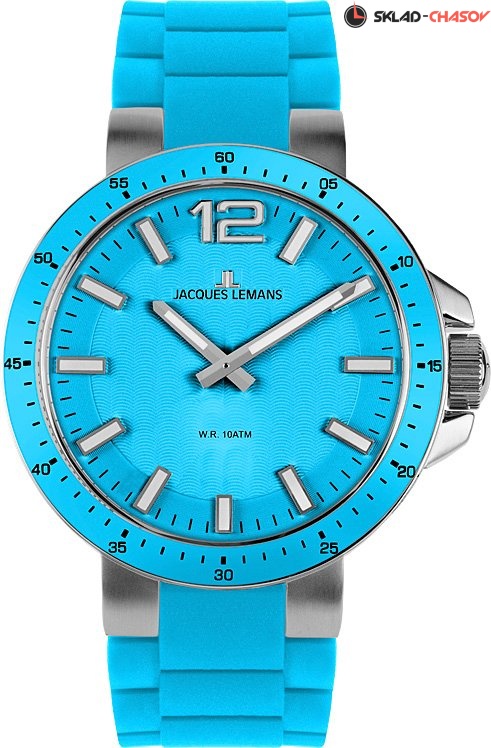 Спортивные женские часы Jacques Lemans могут быть одновременно яркими и модными! Круглый корпус кварцевых часов сделан из нержавеющей стали с гипоаллергенными свойствами. Для заводной головки предусмотрена дополнительная защита. Безель часов контрастный, на него вынесена индикация минут. На широком циферблате расположены хорошо читаемые часовая, минутная стрелки и риски. Повышенная водостойкость составляет 10 АТМ. На часах установлен голубой силиконовый ремешок. Этот приятный на ощупь материал очень прочный и дышащий — идеально подходит для людей, любящих активный образ жизни.