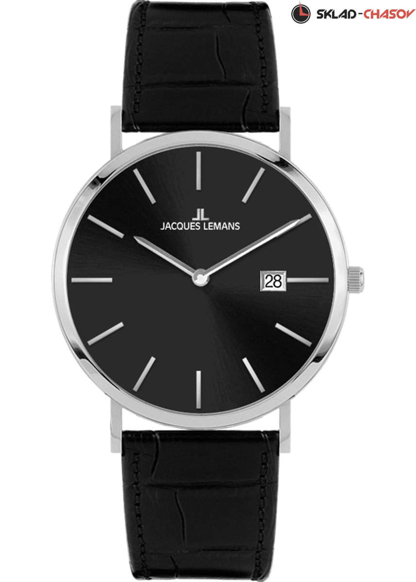 Лаконичные часы выполняют сразу две важные функции: точно показывают время и дату, а также, помогают сделать ваш повседневный образ более стильным и завершенным. Корпус диаметром 38 мм изготовлен из нержавеющей стали, на тонком безеле — зеркальная полировка. Черный циферблат с крупными рисками защищен ударопрочным минеральным стеклом с сапфировым напылением. На ремешок из натуральной кожи черного цвета установлена стальная застежка-пряжка с логотипом бренда Jacques Lemans