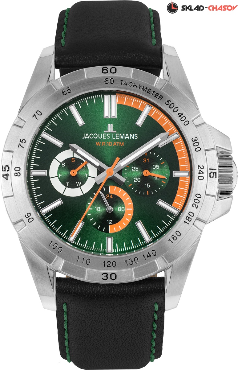 Выраженный спортивный характер дизайна придает особую привлекательность часам серии 42-11. 41-миллиметровый корпус оснащен широким рельефным безелем: на нем разместили тахиметрическую шкалу и дополнительную индикацию секунд. Зеленый циферблат, несмотря на обилие деталей, легко читается. Помогают в этом оранжевые акценты и люминесцентное покрытие часовой, минутной стрелок и рисок, которое светится в темноте. Кварцевый механизм предлагает несколько полезных функций, таких как дата, день недели и индикатор 24-х часов. Ударопрочное минеральное стекло Crystex защищает циферблат от внешних воздействий. 10 атмосфер водостойкости позволяют плавать в часах, не боясь проникновения влаги в механизм. Заводная головка дополнительно защищена — это предусмотрено конструкцией корпуса. Ремешок сделан из натуральной кожи черного цвета.
