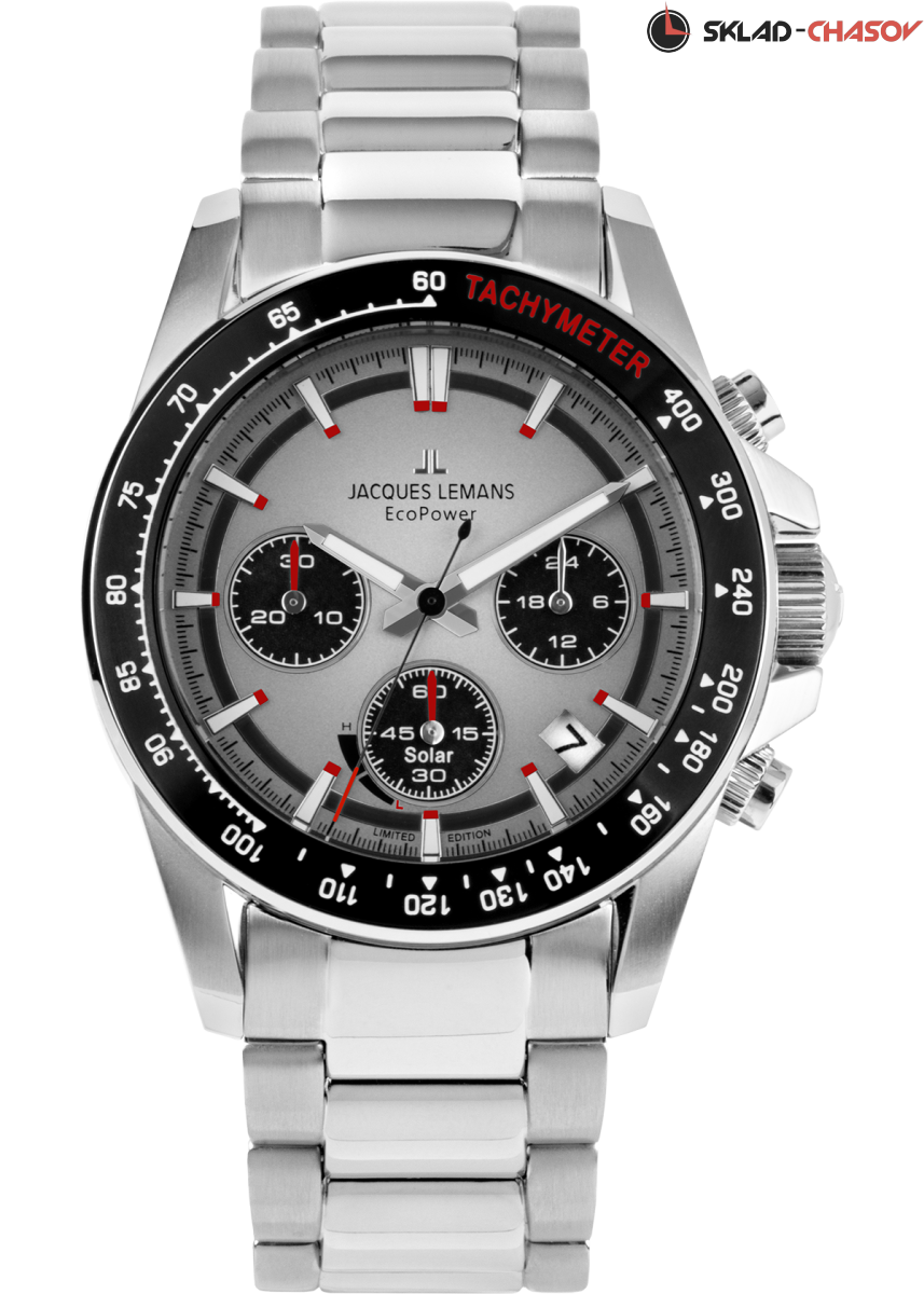 Серия часов 50-1 выпущена в честь важной даты в истории Jacques Lemans – 50-летнего юбилея со дня основания компании. Такое серьезное событие требовало особого подхода, поэтому часы серии 50-1 выделяются из ассортимента бренда. Наверное, главное отличие – механизм. Аккумулятор здесь заряжается от солнечных лучей, для этого на сером циферблате размещена специальная пластина. В позиции 6 часов вы увидите индикатор, который покажет уровень заряда аккумулятора (для удобства на индикаторе есть две буквы, H и L, где H – это высокий уровень заряда, а L – низкий). Часовая и минутная стрелки и риски покрыты люминесцентным составом, который светится в темноте. Корпус диаметром 42 мм сделан из нержавеющей стали, заводная головка и задняя крышка завинчиваются, чтобы обеспечить повышенную водостойкость, равную 10 атмосфер. На заднюю крышку нанесен индивидуальный номер часов в формате ххх/500 и надпись Annyversary edition (Юбилейный выпуск). Механизм часов предусматривает функции хронографа (счетчики минут и секунд), а также индикатор 24-х часов и окошко даты. На широкий безель нанесена тахиметрическая шкала. В модели установлено стойкое к появлению микроцарапин сапфировое стекло. Браслет из нержавеющей стали дополняет застежка-клипса с двумя удобными боковыми кнопками и дополнительной защитой.