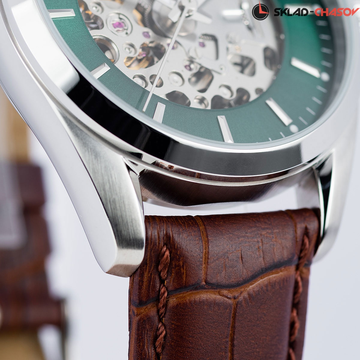 Эти часы-скелетоны открывают вид на волшебный мир механизма с автоподзаводом. За работой его многочисленных деталей можно наблюдать сквозь прозрачные циферблат и заднюю крышку модели. Для определения времени используются хорошо читаемые стрелки и полированные риски. Корпус диаметром 40 мм сделан из прочной нержавеющей стали с гипоаллергенными свойствами. Ударопрочное минеральное стекло Crystex служит надежной защитой от внешних воздействий. Серый ремешок сделан из натуральной кожи с прошивкой. Этот статусный аксессуар в классическим стиле станет важной деталью повседневного или делового образа и ценным экспонатом вашей коллекции часов.