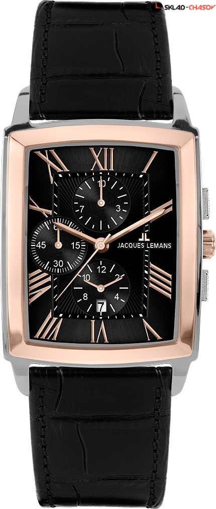 Кварцевый мужской хронограф Jacques Lemans установлен в корпусе из нержавеющей стали с гипоаллергенным эффектом. Его прямоугольная форма подчеркивает элегантный, классический стиль часов. На циферблате продуманно разместили индикаторы 60-секундный накопителя, долей секунд, счетчик минут и часов, даты. Защищает циферблат ударопрочное минеральное стекло Crystex. Стальные элементы модели декорированы с помощью прочного PVD-покрытия из розового золота, что гармонично дополняет черный ремешок из натуральной кожи с прошивкой.