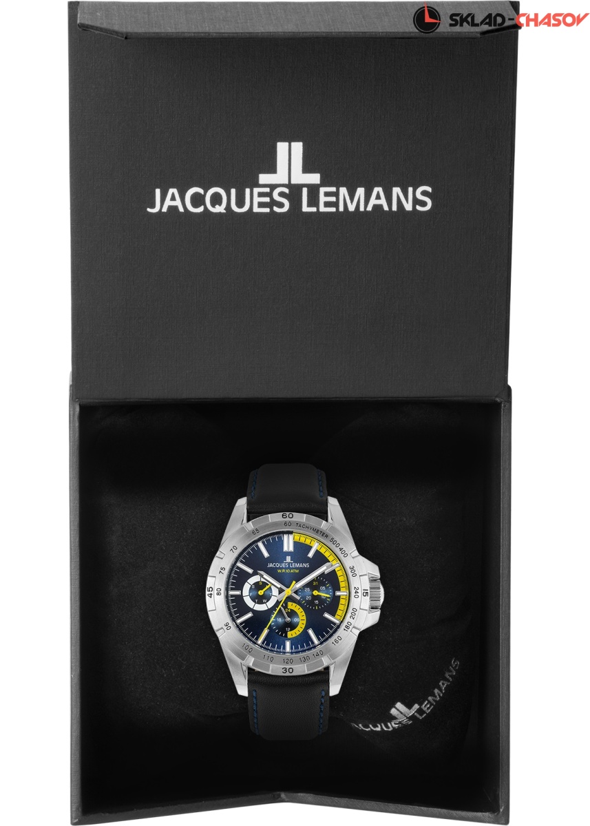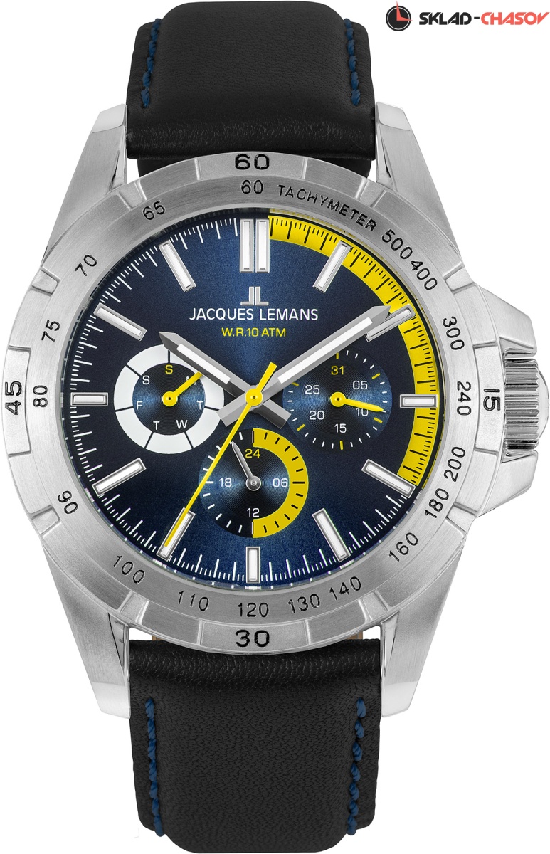 Выраженный спортивный характер дизайна придает особую привлекательность часам серии 42-11. 41-миллиметровый корпус оснащен широким рельефным безелем: на нем разместили тахиметрическую шкалу и дополнительную индикацию секунд. Синий циферблат, несмотря на обилие деталей, легко читается. Помогают в этом ярко-желтые акценты и люминесцентное покрытие часовой, минутной стрелок и рисок, которое светится в темноте. Кварцевый механизм предлагает несколько полезных функций, таких как дата, день недели и индикатор 24-х часов. Ударопрочное минеральное стекло Crystex защищает циферблат от внешних воздействий. 10 атмосфер водостойкости позволяют плавать в часах, не боясь проникновения влаги в механизм. Заводная головка дополнительно защищена — это предусмотрено конструкцией корпуса. Ремешок сделан из натуральной кожи черного цвета.