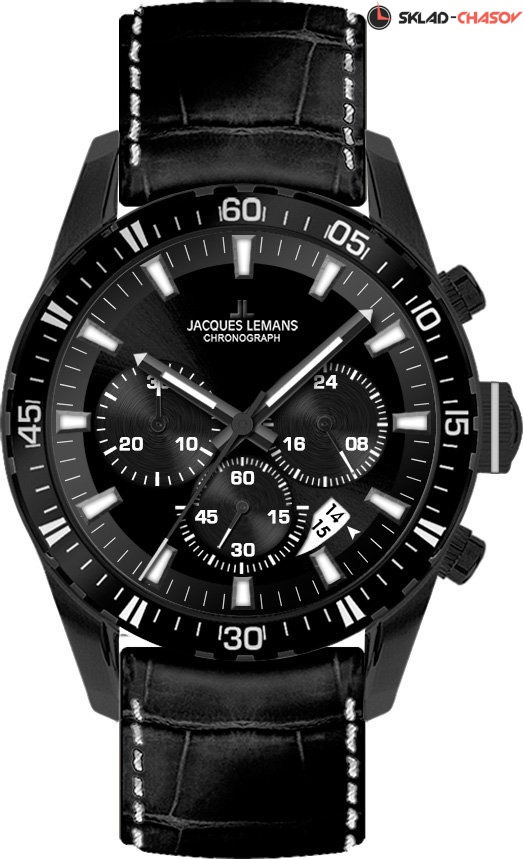 Буквально каждая деталь мужского хронографа от Jacques Lemans говорит о повышенной функциональности и удобстве. Стальной корпус дополнен широким и рельефным безелем с дополнительной индикацией. На черном циферблате расположены 30-минутный накопитель, вынесенная секундная стрелка, индикатор 24-часов и апертура даты необычной формы. Водостойкость повышенная и составляет 10 АТМ. На часах установлен ремешок из натуральной кожи с прошивкой.