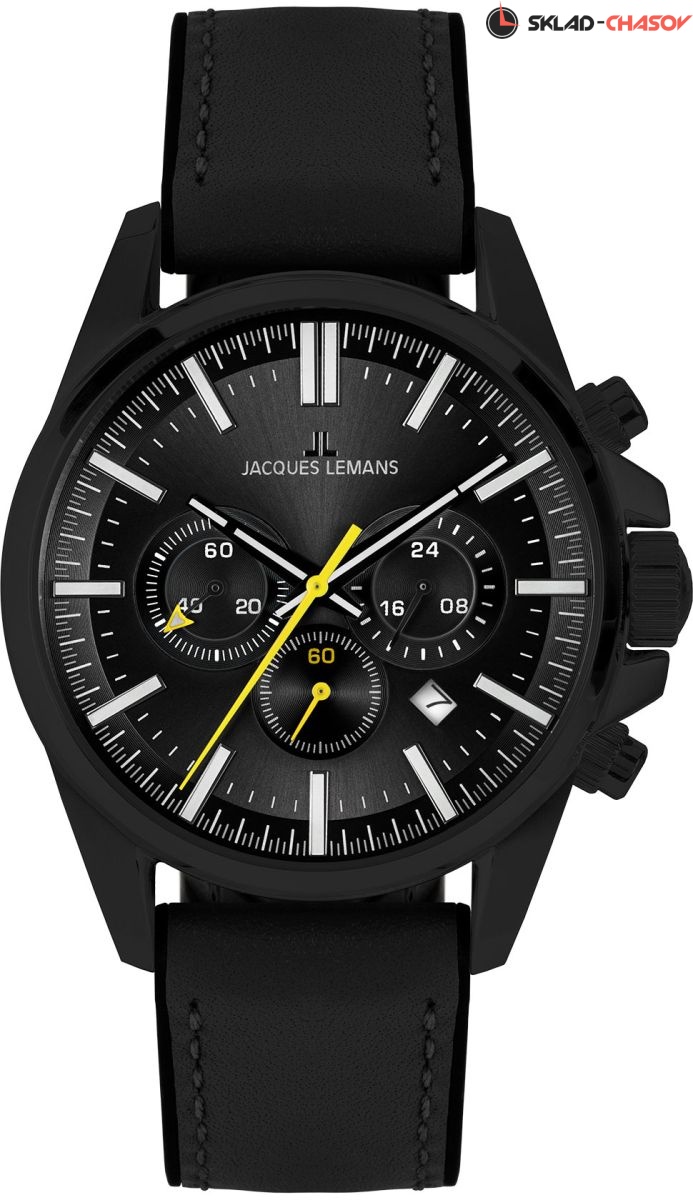 Современный хронограф с точным кварцевым механизмом. Его корпус диаметром 44 мм сделан из нержавеющей стали с PVD-покрытием черного цвета — стильное сочетание, которое, одновременно, позволяет легко комбинировать этот аксессуар с другими вещами вашего гардероба. На черном полированном циферблате расположены дополнительные индикатор 24-х часов, минутный и секундный накопители, окошко даты. Центральные стрелки и риски покрыты специальным люминесцентным составом, который поможет определить время даже в темноте. В модели установлено ударопрочное минеральное стекло Crystex. Повышенная водостойкость равна 10 атмосфер. Верхняя часть ремешка сделана из натуральной кожи черного цвета, внутренняя часть — из силикона. Стильный и надежный хронограф Jacques Lemans будет выигрышно смотреться на вашем запястье в любой ситуации: и на деловой встрече, и во время занятий спортом. Скачать инструкцию в pdf