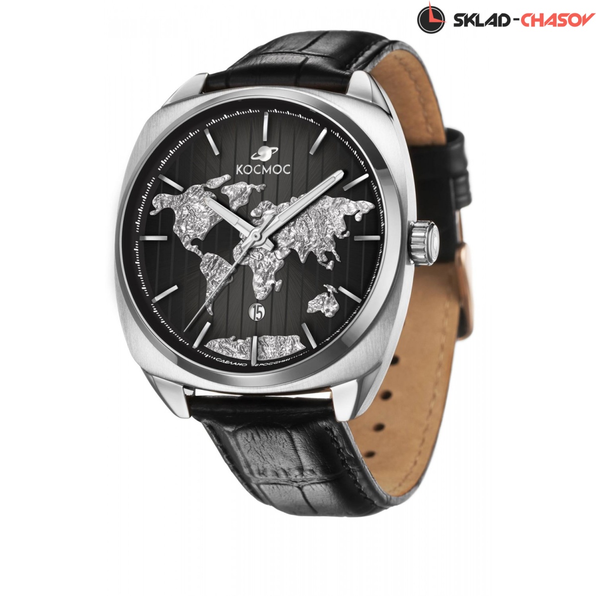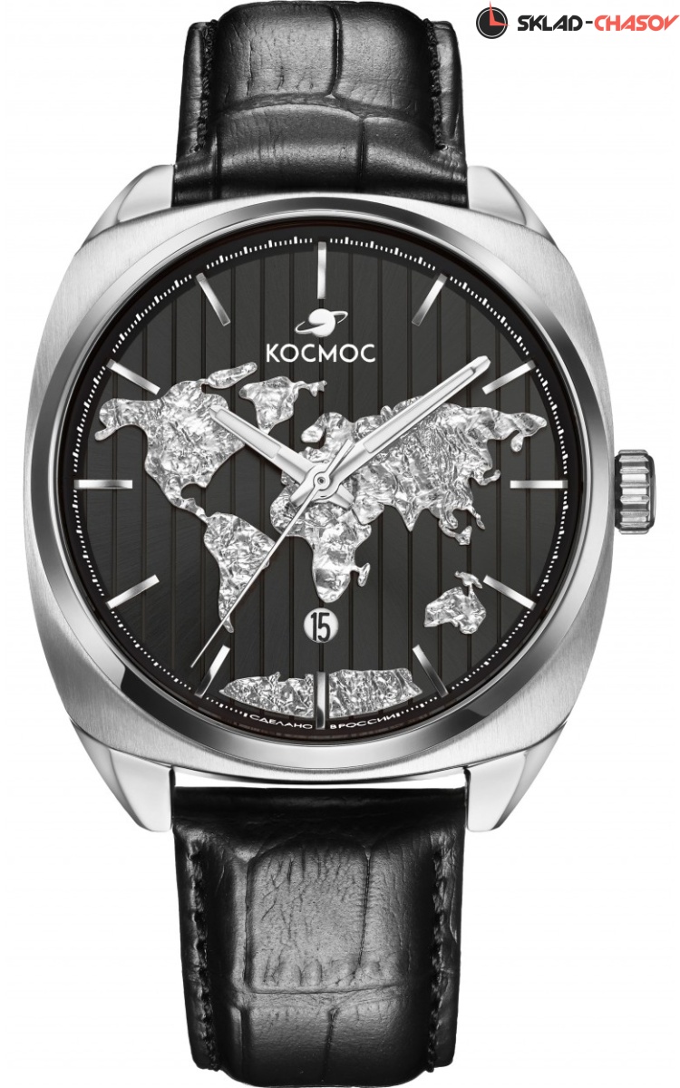 Часы установлены на ремешок из натуральной кожи черного цвета, застежка-пряжка сделана из нержавеющей стали и украшена логотипом бренда Космос.