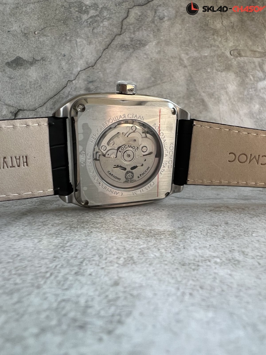 Корпус часов в форме квадрата с закругленными углами сделан из нержавеющей стали, украшенной зеркальной полировкой и сатинированием. Удобная заводная головка имеет форму гайки. Задняя крышка прозрачная, что традиционно для механических часов. Сквозь это специальное окошко можно увидеть работу механизма TMI. Его подвижный ротор не только позволяет заводить пружину механизма от обычных движений руки, но и несет важную информацию: на нем вы увидите надпись «Сделано в России». Украшением служит гравировка, изображающая космонавта. Задняя крышка крепится на четырех винтах, что обеспечивает повышенную водостойкость в 10 атмосфер (100 метров). Цифры в формате от 01/50 до 50/50 обозначают индивидуальный номер модели. Ушки корпуса имеют эргономичную форму — это позволяет часам комфортно лежать на запястье. Объемный циферблат черного цвета состоит из двух уровней. В центре первого движутся три стрелки, часовая и минутная - с люминесцентным покрытием. Второй уровень декорирован гильоше в виде солнечных лучей. Индексы накладные, как и стальная рамка, выделяющая сдвоенное окошко даты и дня недели. Обратите внимание, что для индикации дня недели используется два языка: русский и английский. Сапфировое стекло с антибликовым покрытием обеспечивает защиту циферблата и хорошую читаемость показаний, независимо от условий видимости.