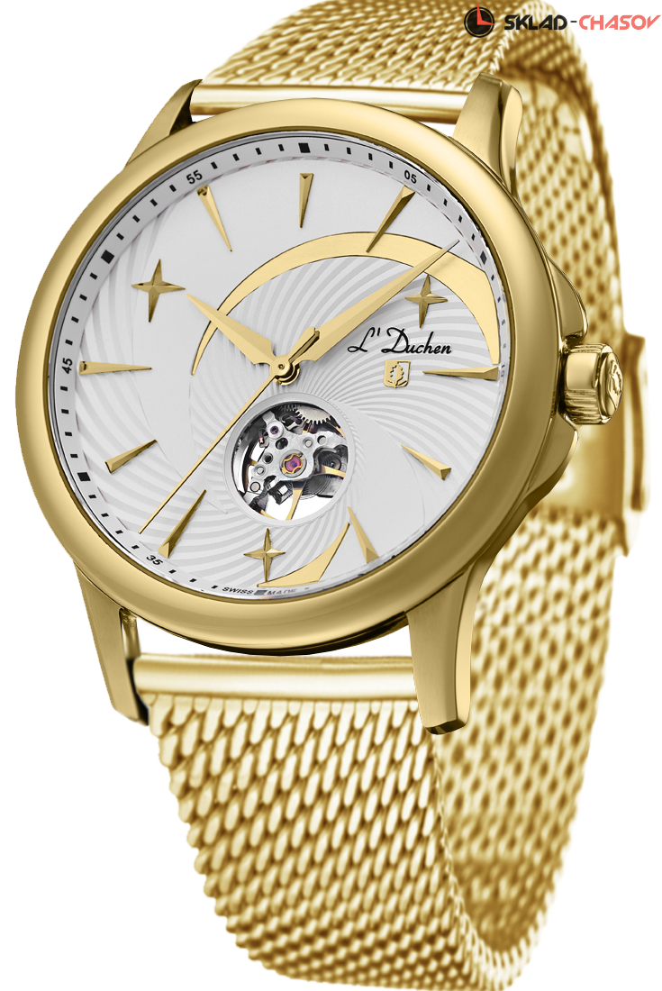 Элегантные и практичные мужские механические часы с автоподзаводом коллекции Supernova представлены в тонком корпусе из высоколегированной нержавеющей стали с PVD-покрытием цвета золота. Боковая часть корпуса оснащена защитой заводной головки от случайных ударов и механических воздействий. Чередование гладких и рельефных частей на заводной головке создает удобство при использовании. Изображение на многоуровневом циферблате создает ощущение движения и напряжения. С помощью гравировки в виде вихревых структур и металлических элементов дизайнеры передали процесс сжатия, подготовки к взрыву звезды – явление, названное учеными «сверхновая звезда» или Supernova. Три восьмигранные звезды на циферблате дополняют сюжет, напоминая сияние и рождение новых звезд во Вселенной. Создание этих элементов – сложный технологический процесс и требует большой точности при выполнении. На черном циферблате расположено окошко, через которое можно наблюдать движение «сердца часов» - баланса механизма. На нем по центру расположен рубин и мост, декорированный в стиле «перлаж». Индексы часов выполнены вручную в виде четырехгранных пирамидок, что создает эффект игры света. Мечеобразная форма стрелок делает их объемными и хорошо читаемыми.