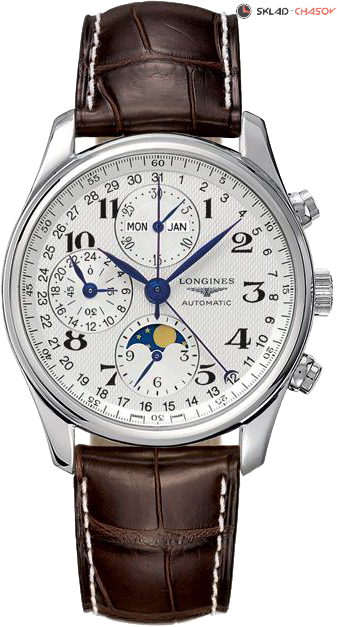 Мужской хронограф, индикация даты отдельной стрелкой по кругу, окошко дня недели и месяца в положении 12 часов, индикация фазы луны в положении 6 часов, прозрачная задняя крышка