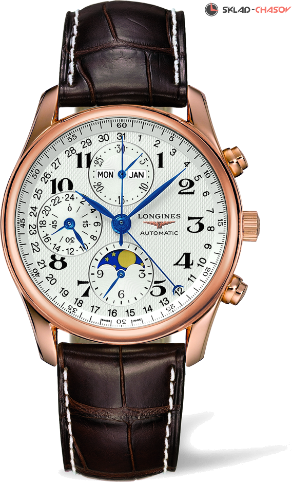 Мужской хронограф, индикация даты отдельной стрелкой по кругу, окошко дня недели и месяца в положении 12 часов, индикация фазы луны в положении 6 часов, прозрачная задняя крышка