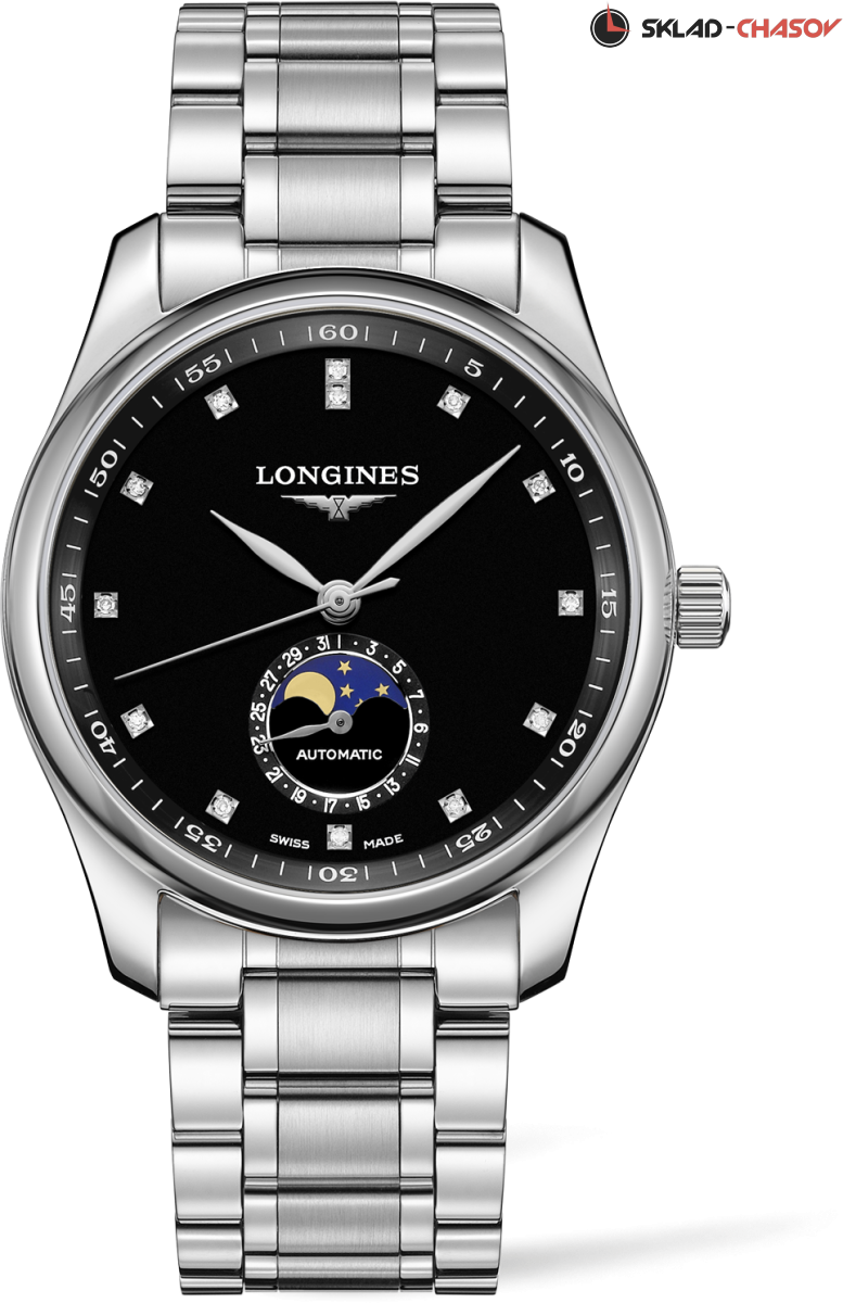 Выразительная и классическая мужская модель, механические с автоподзаводом, индикация времени центральными стрелками. Указатель даты и фазы луны в районе 6 часов. 13 бриллиантов на циферблате 0.059ct.