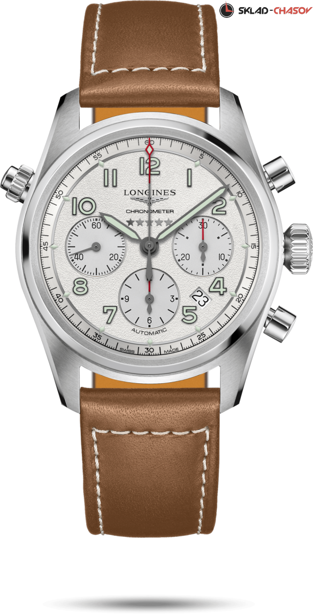 Современная стилистика авиационных моделей часов Longines. Механические с автоподзаводом, апертура даты между 4 и 5 часами. Вынесенная секундная стрелка в районе 9 часов, часовой счётчик хронографа в районе 6 часов, минутный счетчик хронографа в районе 3 часов. Индикация часов и минут центральными стрелками. Хронометр C.O.S.C.