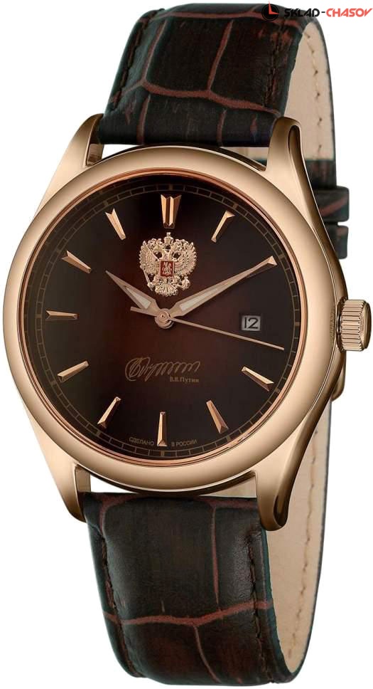 Часы на ремешке станут отличным вариантом на каждый день. Ваш безупречный стиль! Премьер. Мужские наручные часы. В механизме 21 камень, частота 21600 полуколебаний в час. Запас хода 42 часа. Круглый стальной корпус. На циферблате изображение герба Российской Федерации и автографа В.В. Путина. Острые стрелки в стиле Alpha с люминесцентным покрытием, которое светится в темноте после непродолжительной зарядки на свету. Метки в виде штрихов. Окошко даты находится в положении 3 часа. Рифленая заводная головка. Текстурированный кожаный ремешок с классической застежкой.