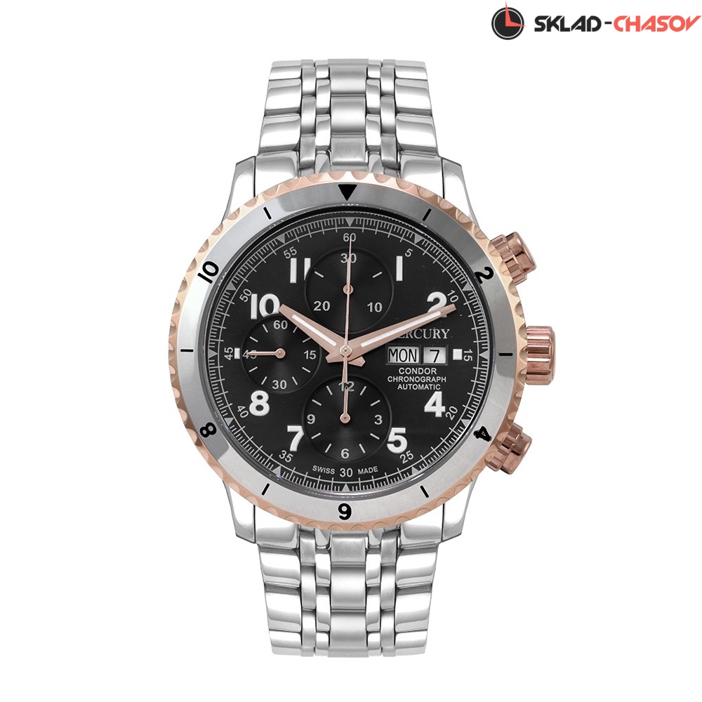 Автоматические Мужские часы Mercury, коллекция Condor (MEA476-SR-2), производство ШВЕЙЦАРИЯ, диаметр - 45 мм, материал корпуса - Сталь и Розовый PVD, Браслет, материал браслета - Сталь, циферблат - Черный, Арабские цифры, Дата, День недели, Хронограф