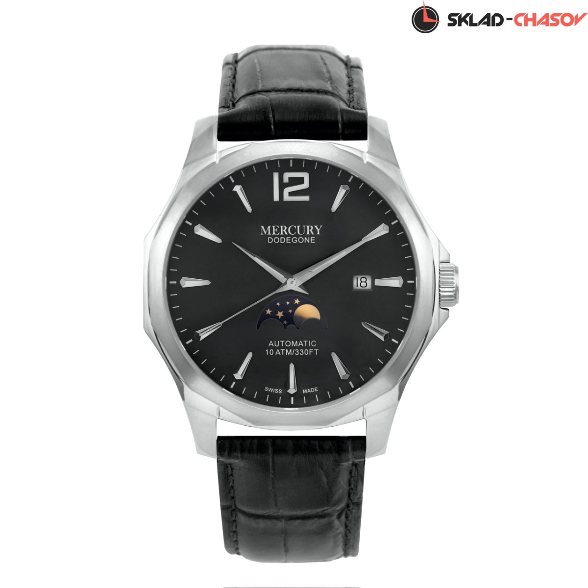 Автоматические Мужские часы Mercury, коллекция Dodegone (MEA480-SL-3), производство ШВЕЙЦАРИЯ, диаметр - 44 мм, материал корпуса - Сталь, Ремень, материал браслета - Кожа, циферблат - Черный, Арабские цифры и Метки, Дата, Фаза Луны