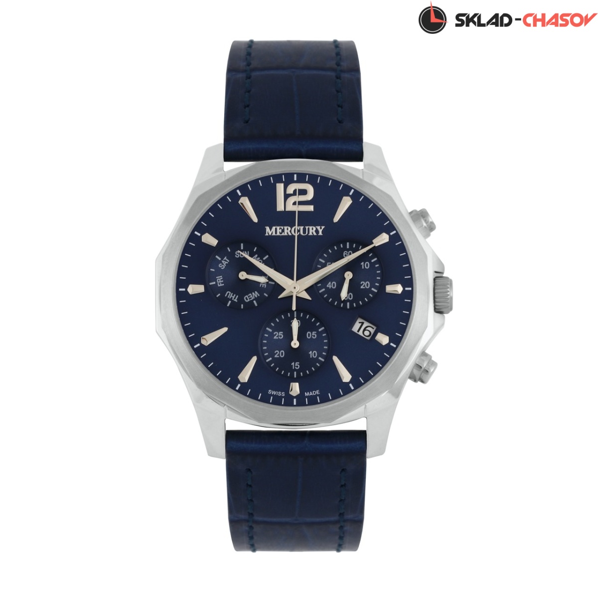 Кварцевые Мужские часы Mercury, коллекция Dodegone (MEC463-SL-9), производство ШВЕЙЦАРИЯ, диаметр - 43,5 мм, материал корпуса - Сталь, Ремень, материал браслета - Кожа, циферблат - Синий, Арабские цифры и Метки, Дата, День недели, Хронограф