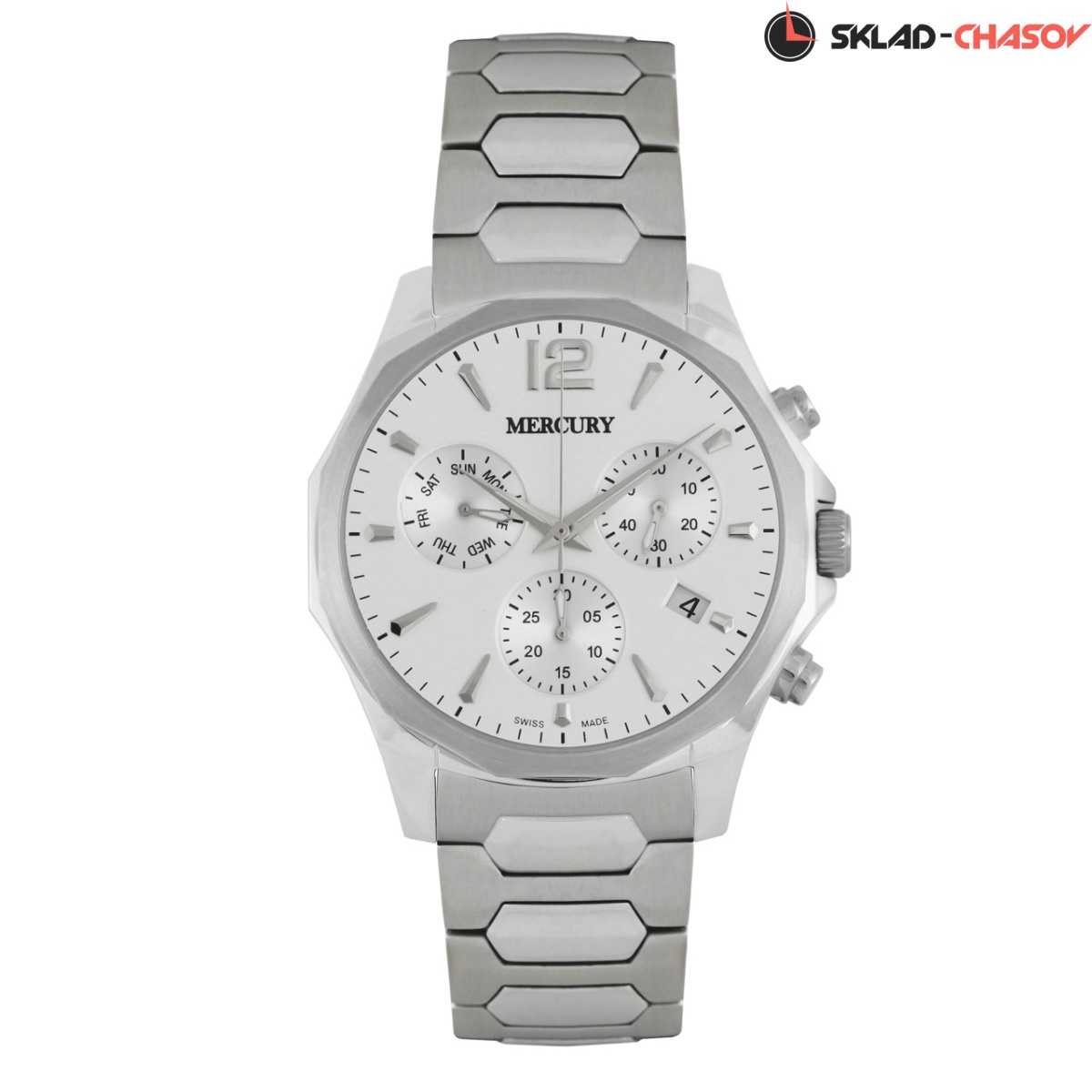 Кварцевые Мужские часы Mercury, коллекция Dodegone (MEC463-SS-1), производство ШВЕЙЦАРИЯ, диаметр - 43,5 мм, материал корпуса - Сталь, Браслет, материал браслета - Сталь, циферблат - Белый, Арабские цифры и Метки, Дата, День недели, Хронограф