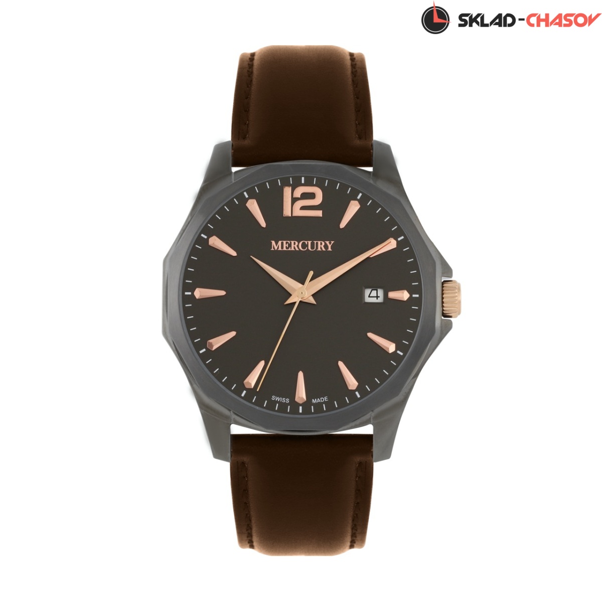 Кварцевые Мужские часы Mercury, коллекция Dodegone (MEM466-BRL-3), производство ШВЕЙЦАРИЯ, диаметр - 41 мм, материал корпуса - Матовая оружейная сталь, Ремень, материал браслета - Кожа, циферблат - Черный, Арабские цифры и Метки, Дата