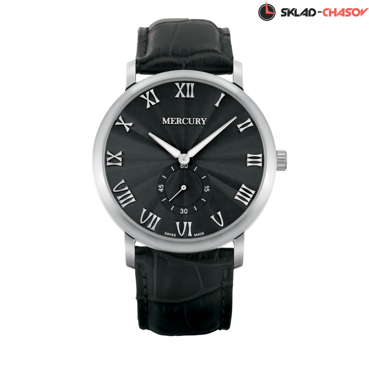 Кварцевые Мужские часы Mercury (ME405-SL-3), производство ШВЕЙЦАРИЯ, диаметр - 42 мм, материал корпуса - Сталь, Ремень, материал браслета - Кожа, циферблат - Черный, Римские цифры