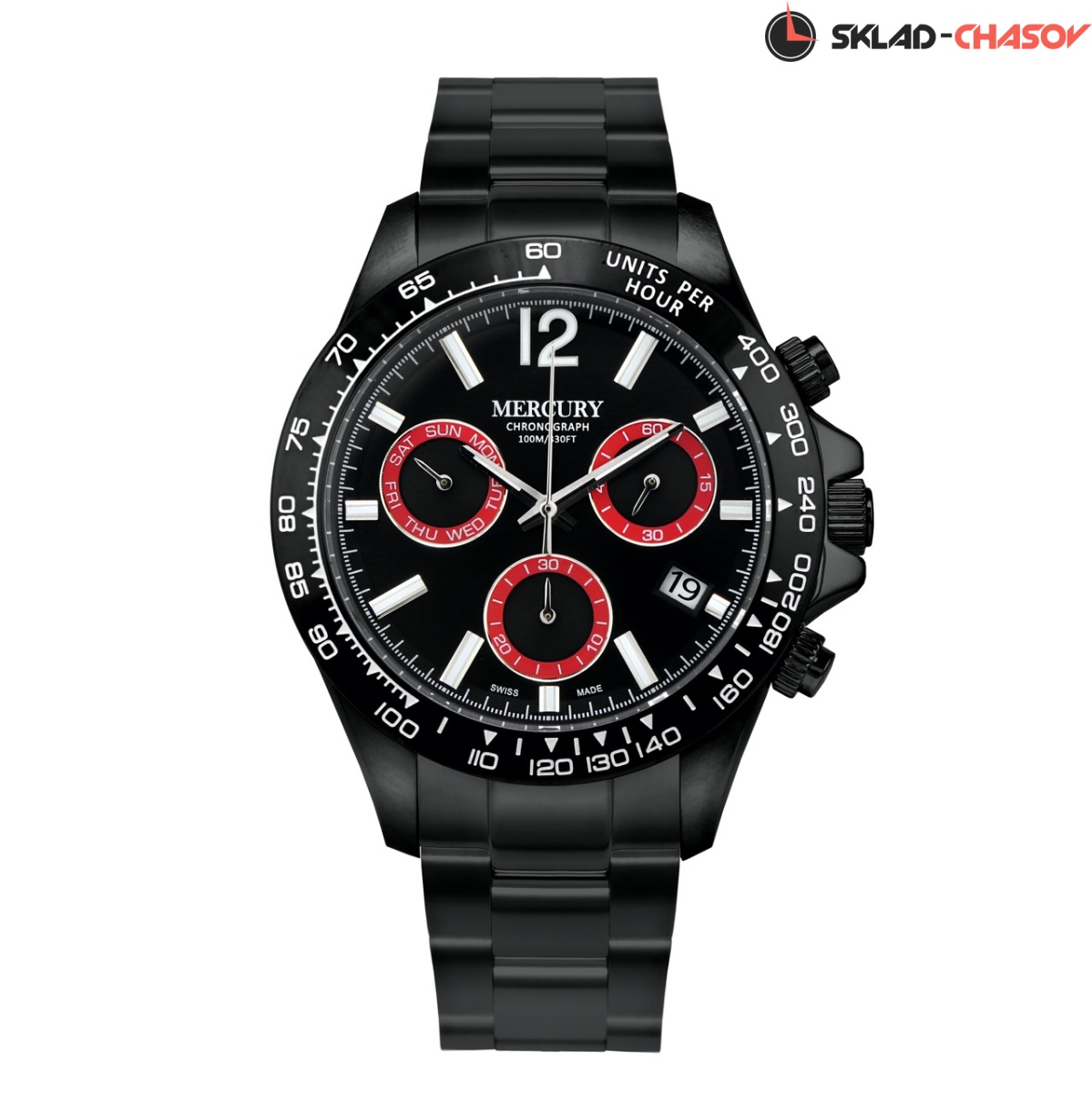 Кварцевые Мужские часы Mercury (MEC485-BB-3), производство ШВЕЙЦАРИЯ, диаметр - 45 мм, материал корпуса - Сталь и Черный PVD, Браслет, материал браслета - Сталь, циферблат - Черный, Арабские цифры и Метки, Дата, День недели, Хронограф