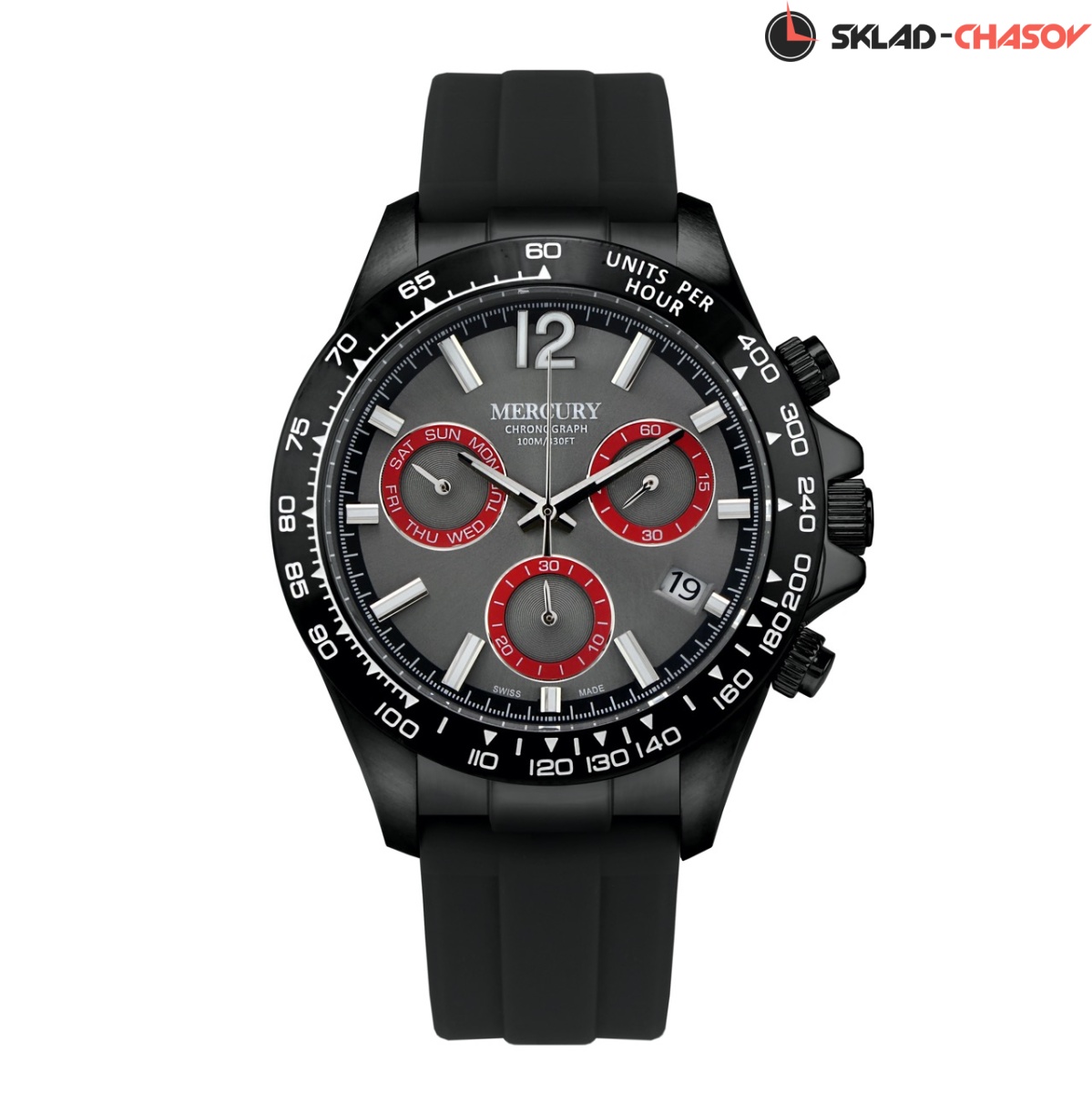 Кварцевые Мужские часы Mercury (MEC485-BBX-3), производство ШВЕЙЦАРИЯ, диаметр - 45 мм, материал корпуса - Сталь и Черный PVD, Ремень, материал браслета - Каучук, циферблат - Черный, Арабские цифры и Метки, Дата, День недели, Хронограф
