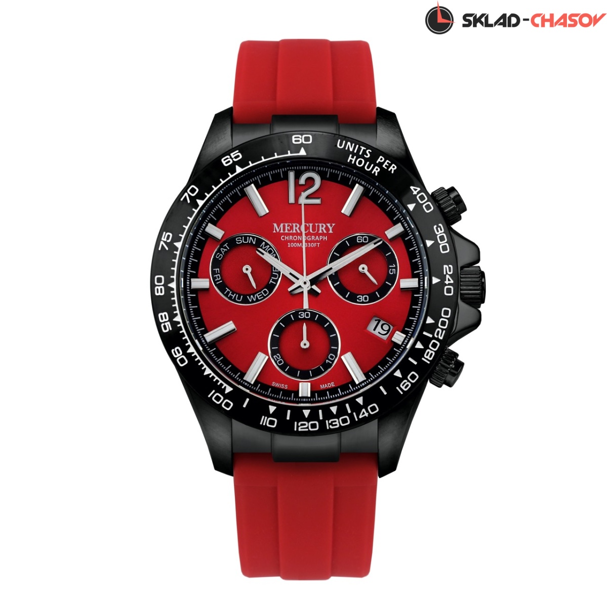Кварцевые Мужские часы Mercury (MEC485-BBX-5), производство ШВЕЙЦАРИЯ, диаметр - 45 мм, материал корпуса - Сталь и Черный PVD, Ремень, материал браслета - Каучук, циферблат - Красный, Арабские цифры и Метки, Дата, День недели, Хронограф