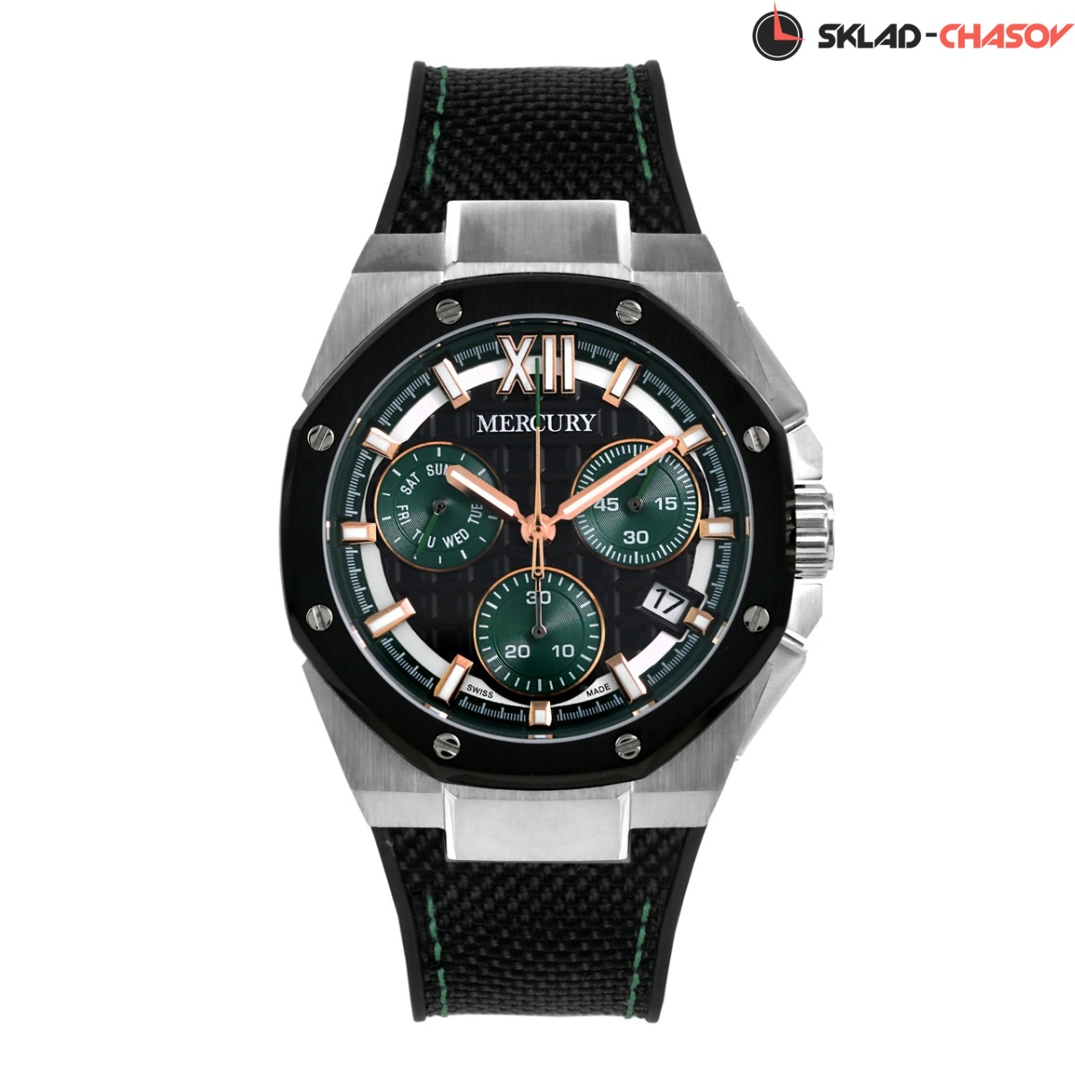 Кварцевые Мужские часы Mercury (MEC486-SL-12), производство ШВЕЙЦАРИЯ, диаметр - 42,5 мм, материал корпуса - Сталь, Ремень, материал браслета - Кожа, циферблат - Черный, Римские цифры и Метки, Дата, День недели, Хронограф