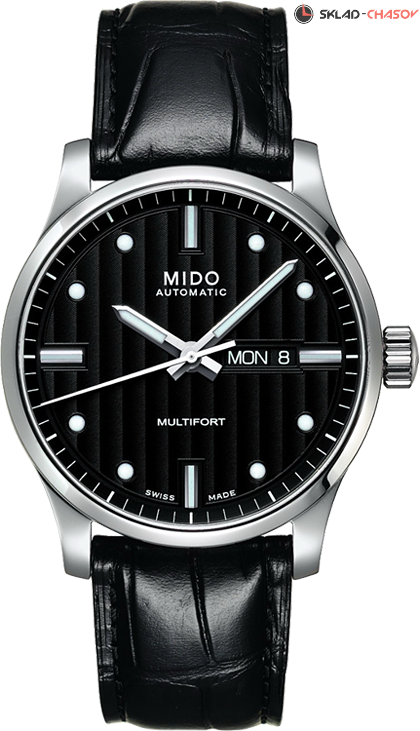 Мужская модель с индикацией часов, минут и секунд центральными стрелками, окошко даты и дня недели в положении 3 часа.