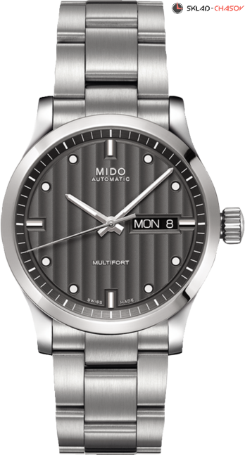 Мужские часы. Индикация часов, минут, секунд центральными стрелками. Окошко даты и дня недели в положении 3 часа. Циферблат украшен узором гильоше.
